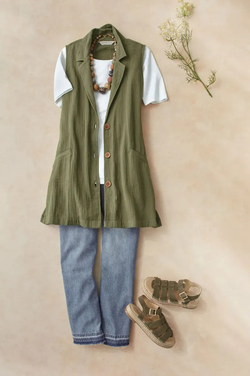 Product Description This button-front gauze vest pulls your look together effortlessly as a great, lightweight layering piece across seasons, or from day into evening. Styled with a shirt collar and slant pockets, with long side slits at the hem.