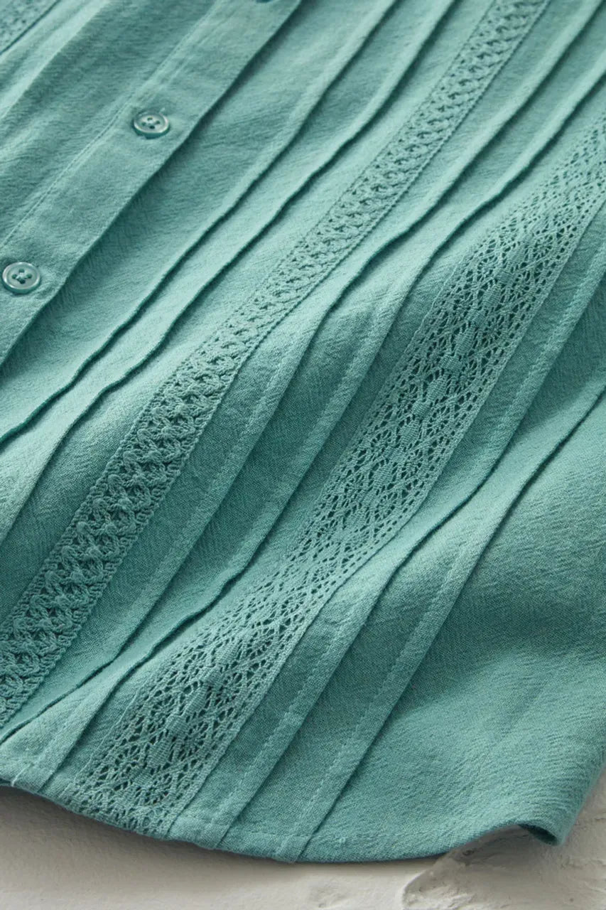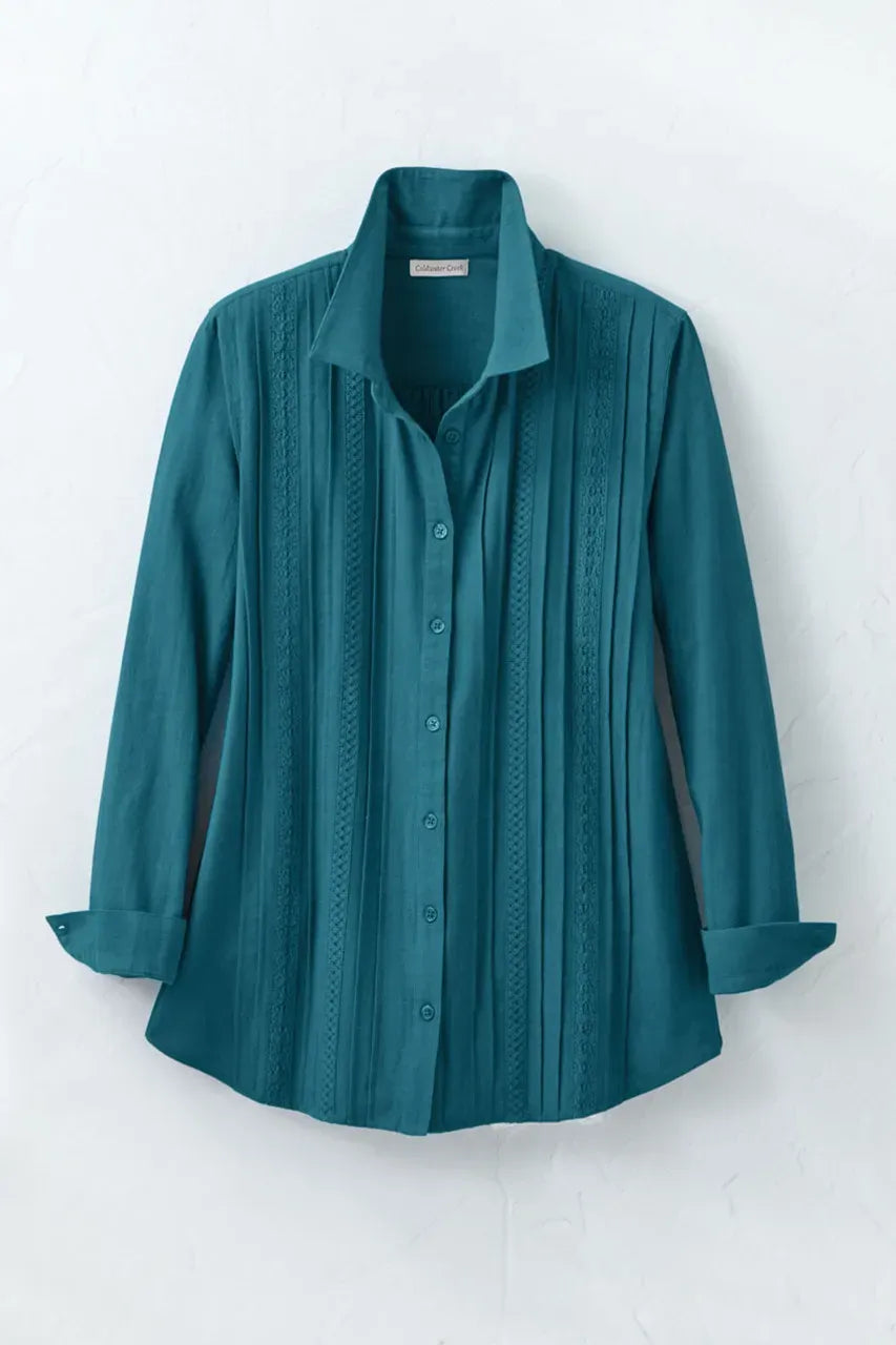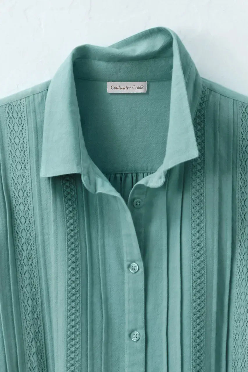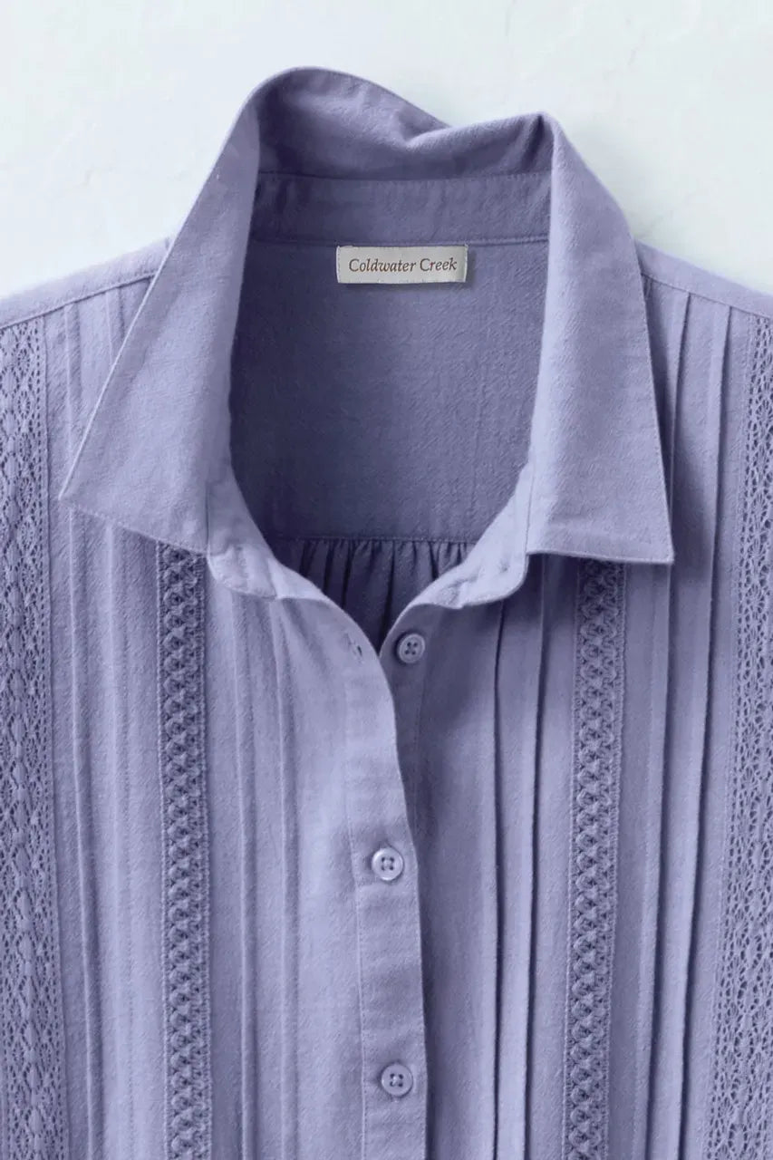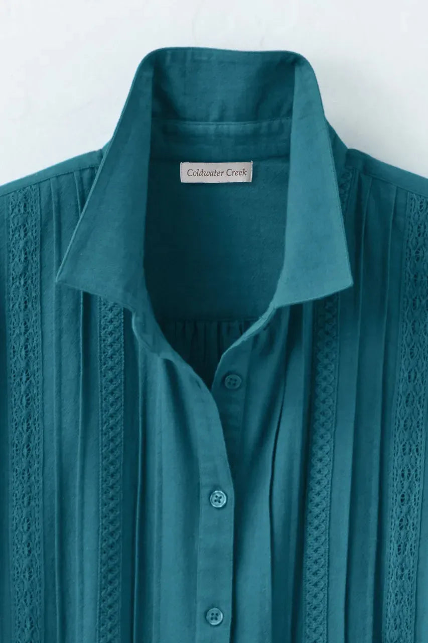 Our shirt-style tunic top is a perfect layering piece, with pintucks and lace adding special touches to our gently crinkled cotton fabric. This lightweight piece dresses up or down beautifully. Shirred back yoke, curved hem and long button-cuff sleeves.
