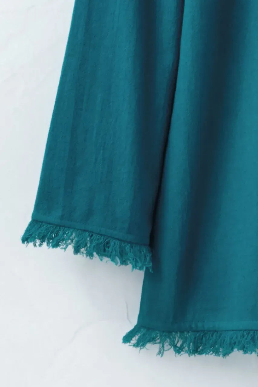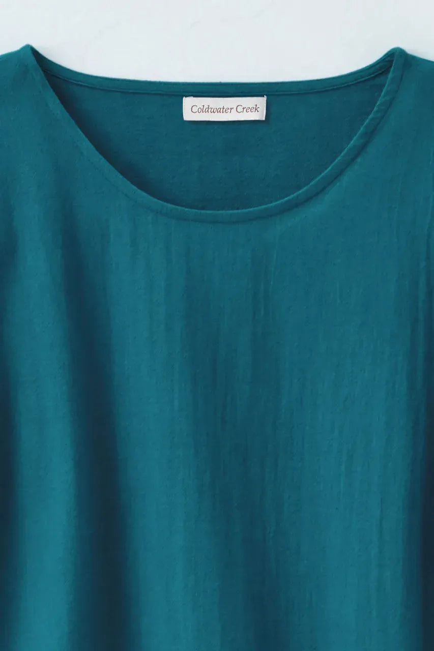 Product Description An effortlessly elegant top cut from lightweight crinkled cotton is a welcome piece to your wardrobe. Popover top features fringe detail at the cuffs and hem for a boho touch. 3/4 sleeves, straight hem.