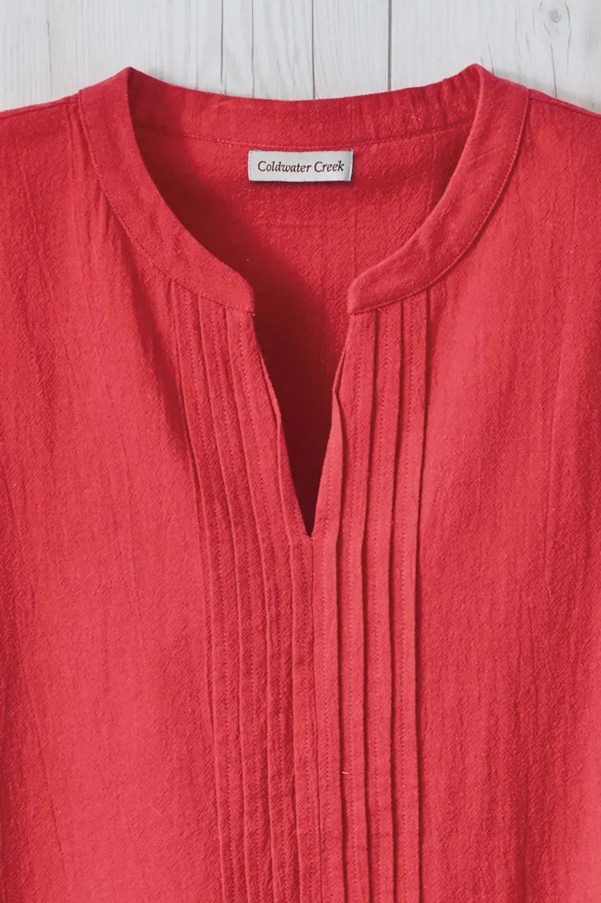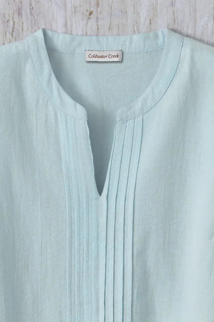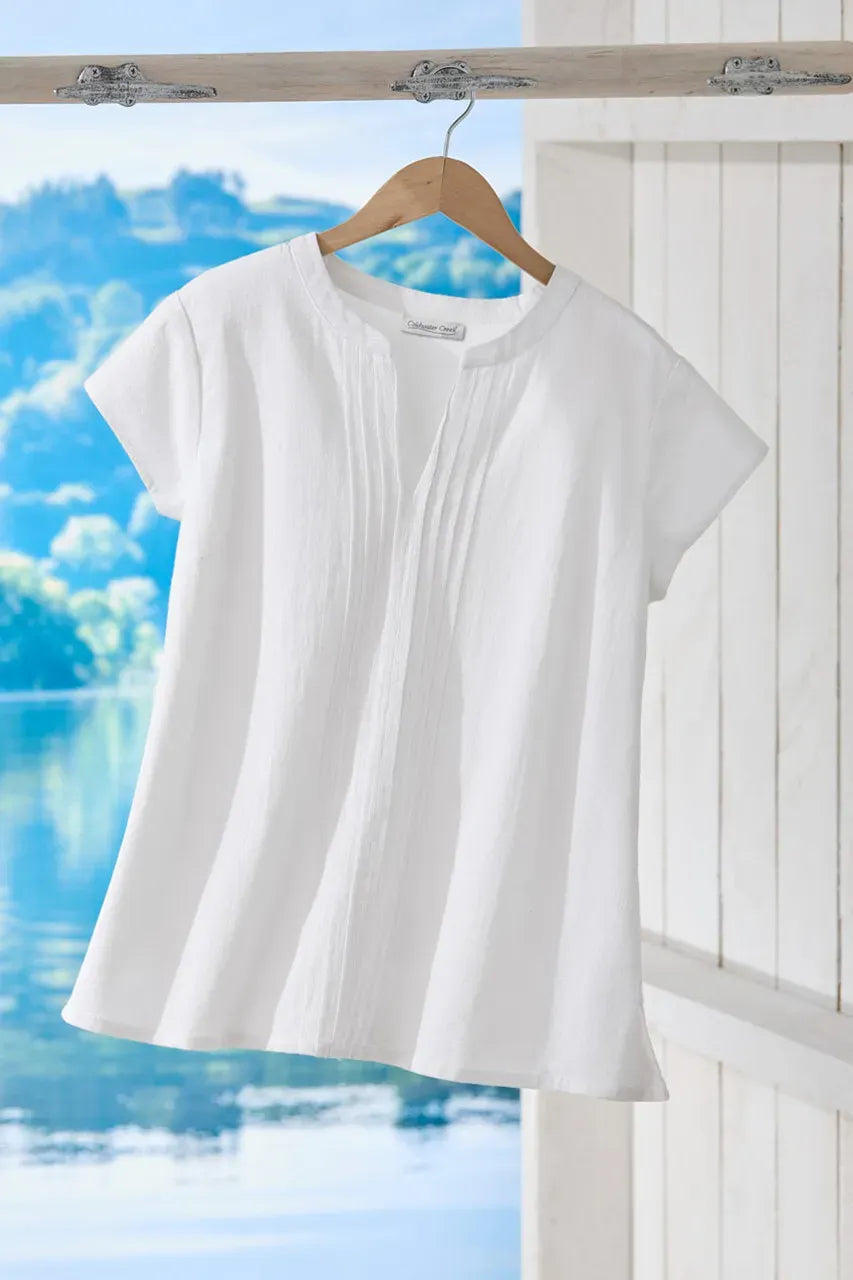 Our favorite lightweight crinkled cotton, in a silhouette that works for endless summer looks. Pintucked front, with banded collar and bust darts.