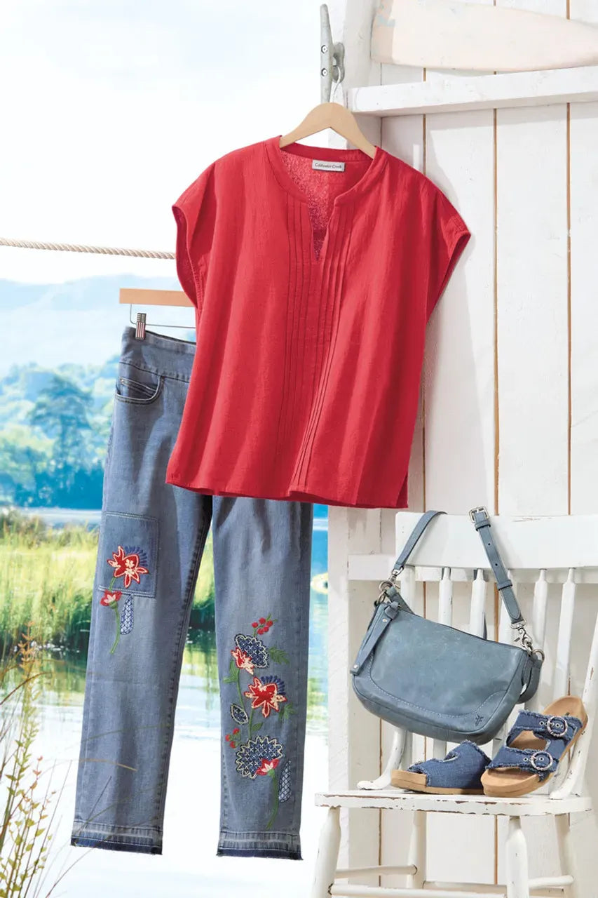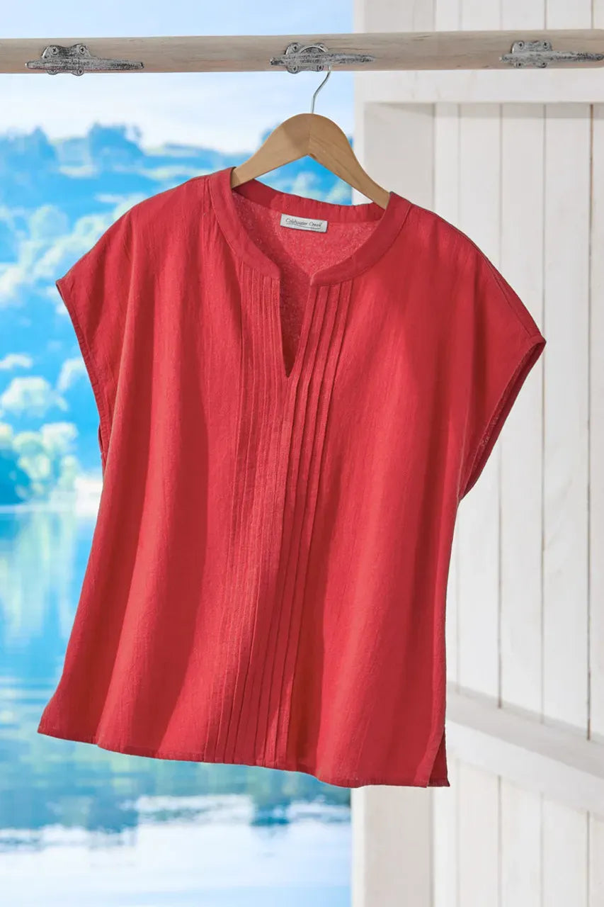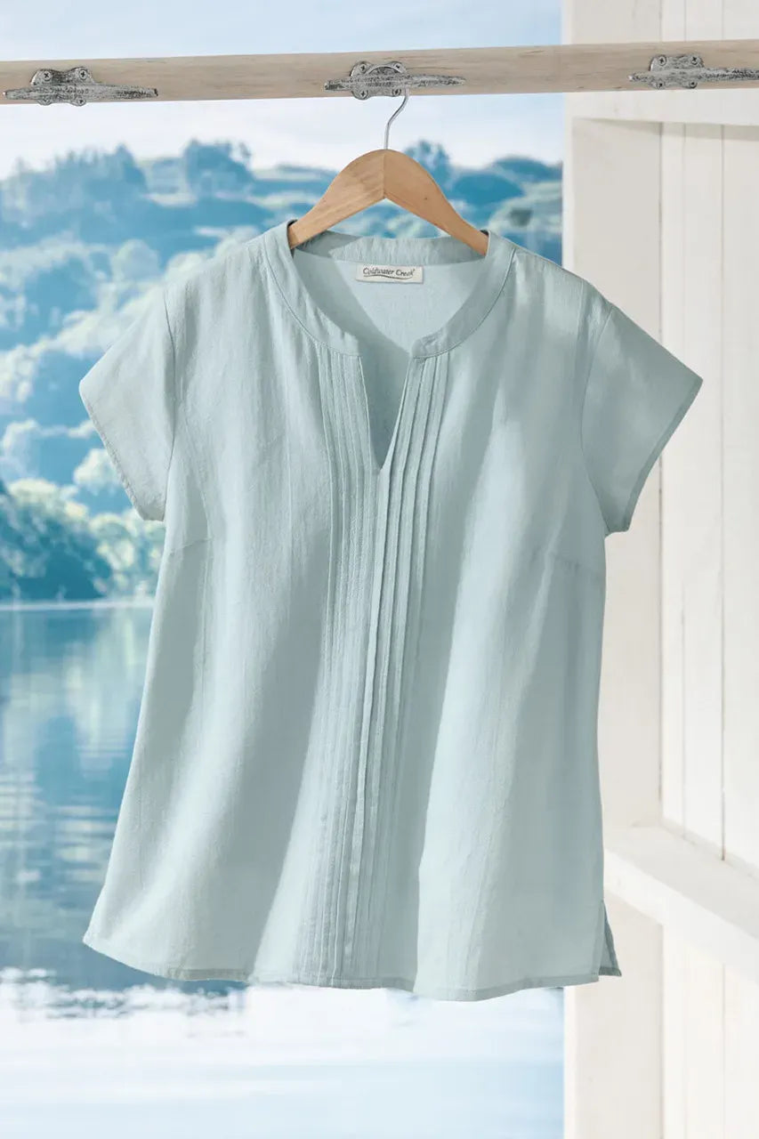 Our favorite lightweight crinkled cotton, in a silhouette that works for endless summer looks. Pintucked front, with banded collar and bust darts.