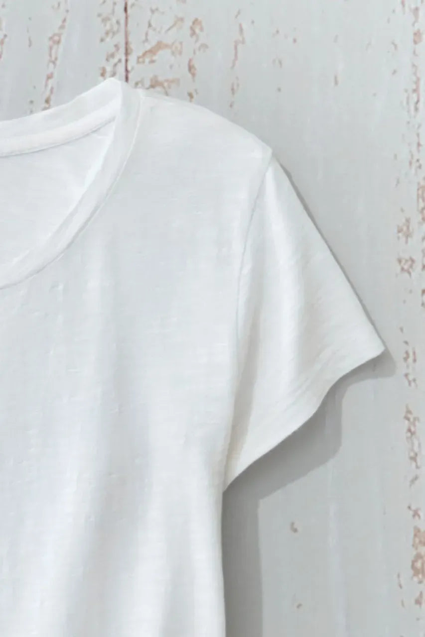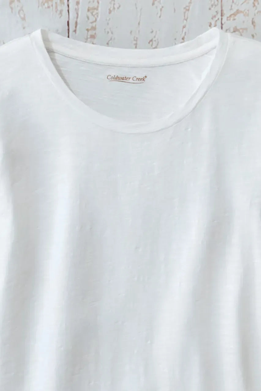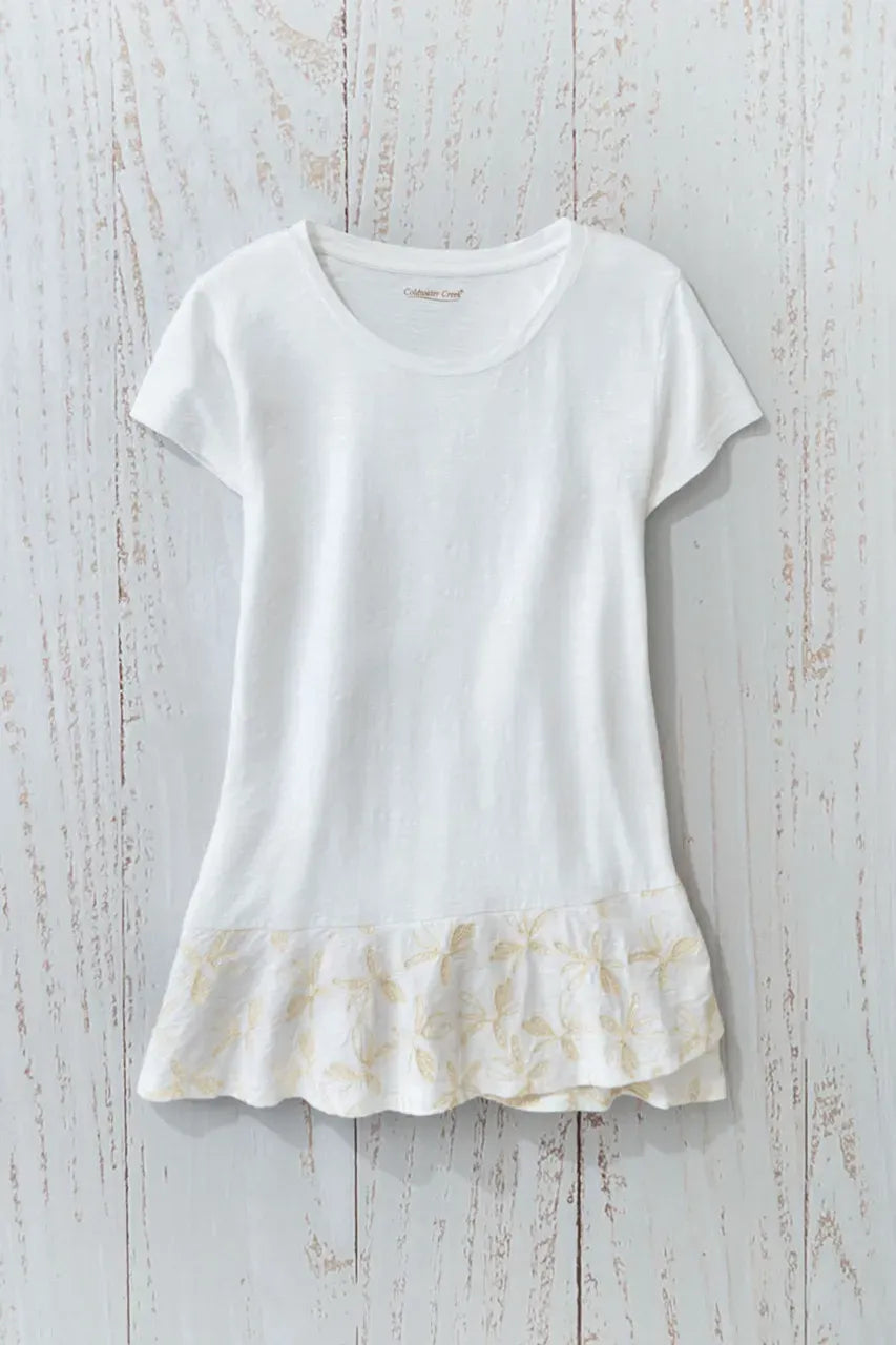 The tee that always feels special. Delicate embroidery traces a flounced crossover hem, and the slightly lighter weight is comfortable alone or layered across seasons.