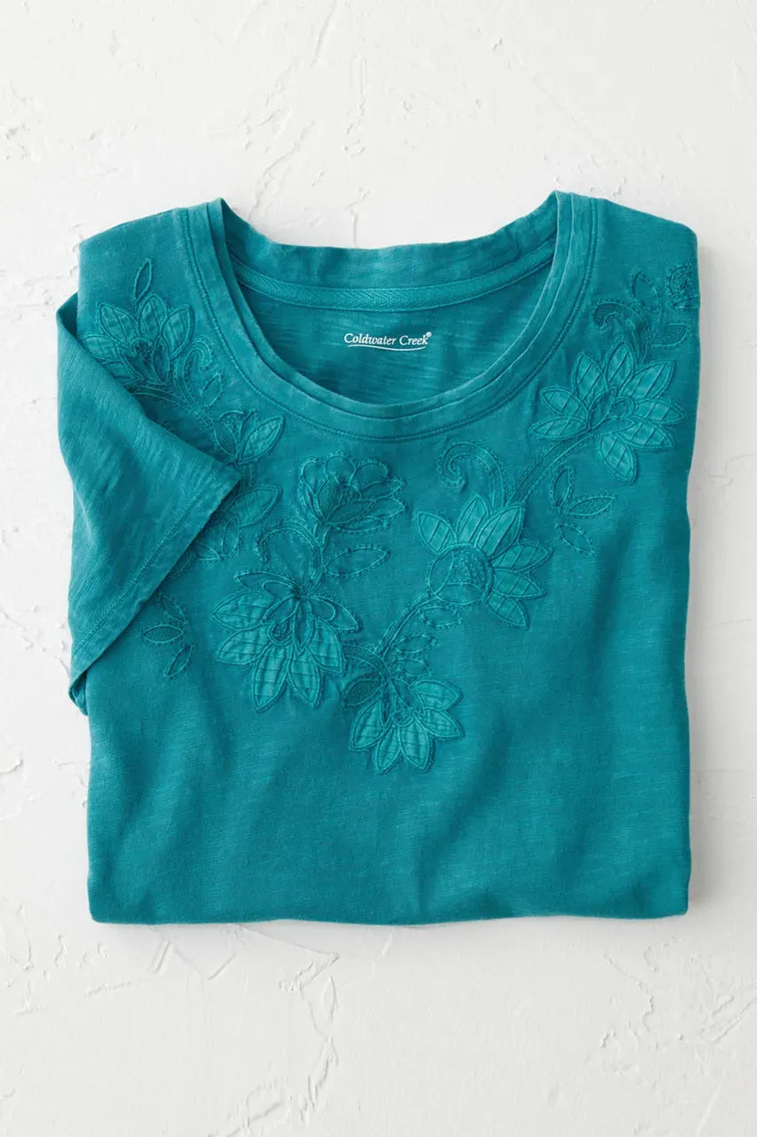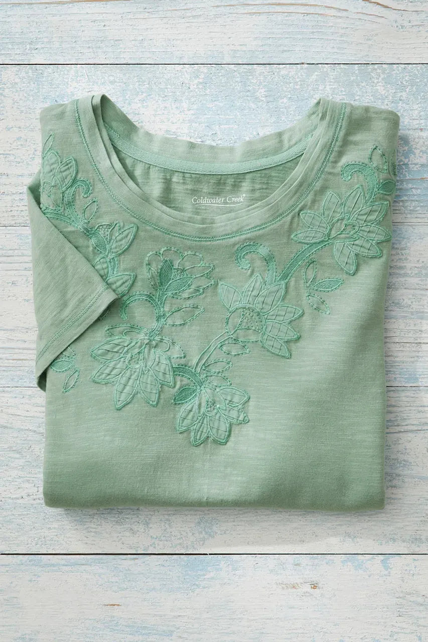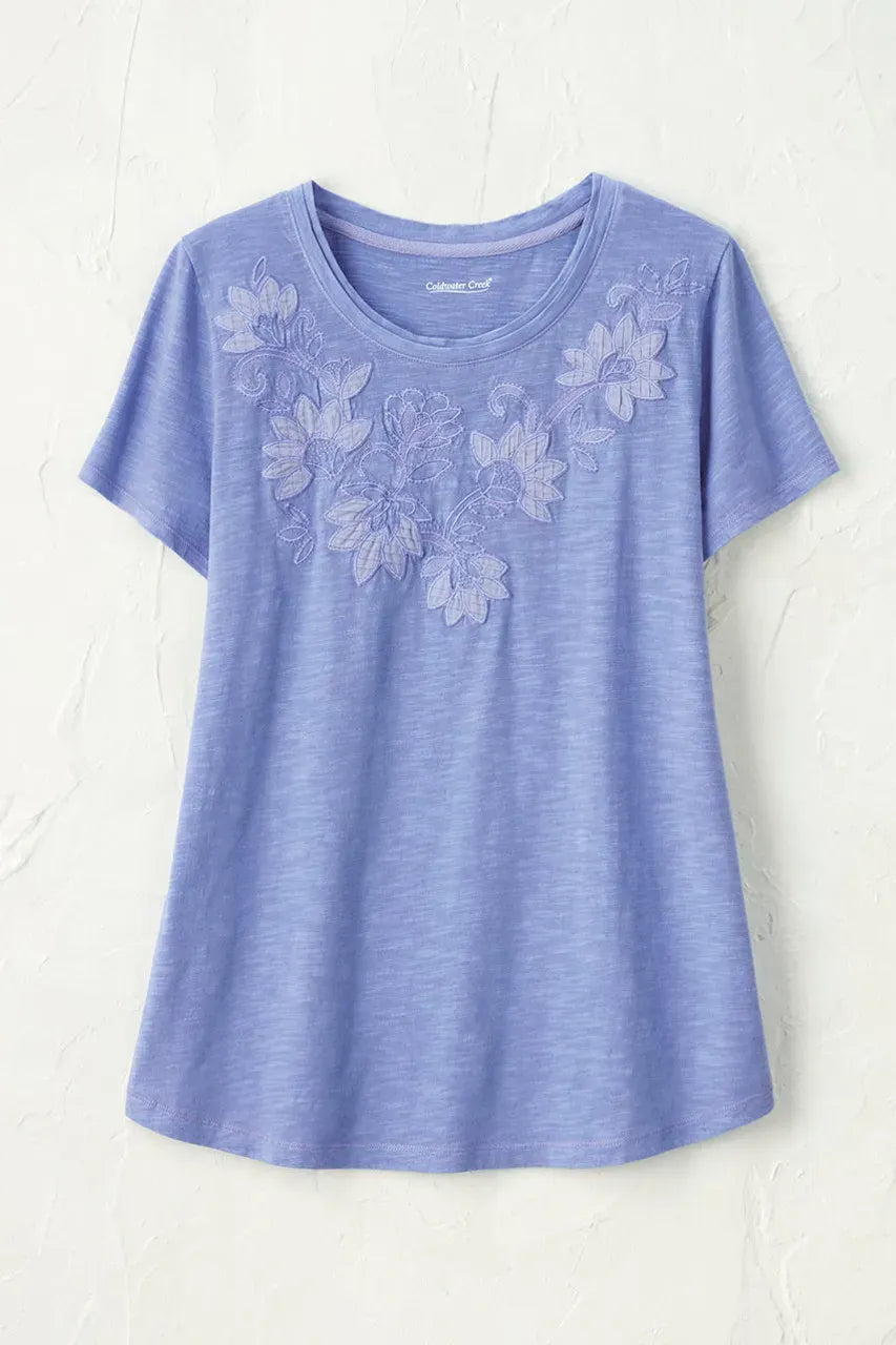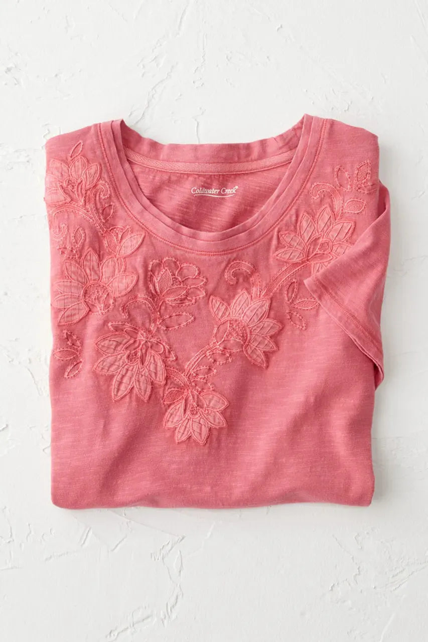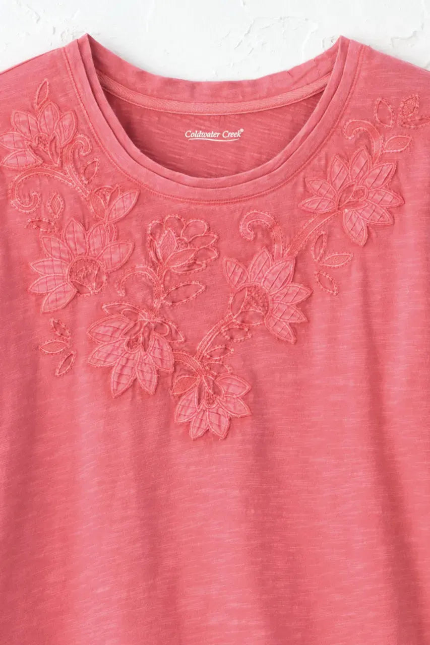 Product Description Softly textured slub-knit tee is romanced with floral ribbon appliqués and finished with a layered neckline. Solid back, curved hem. Imported.