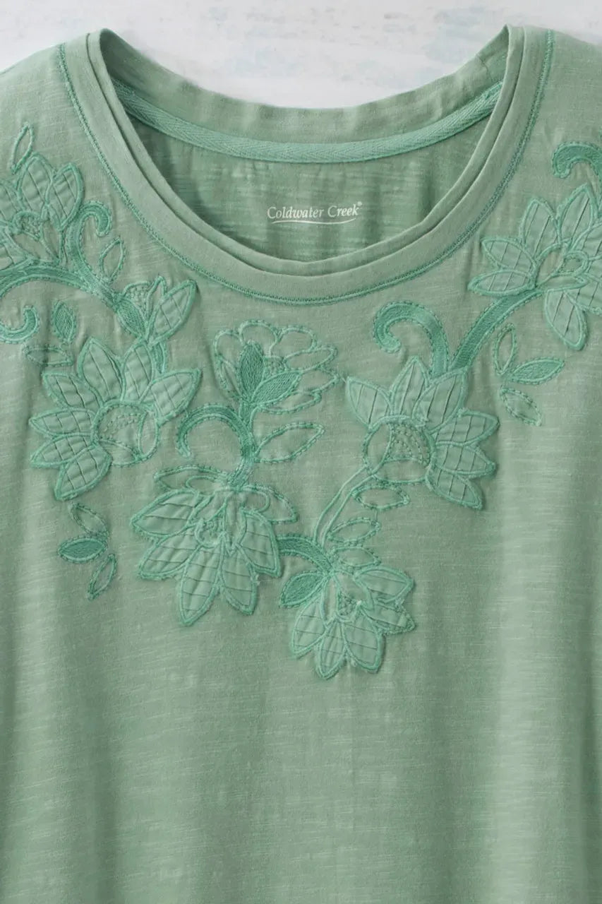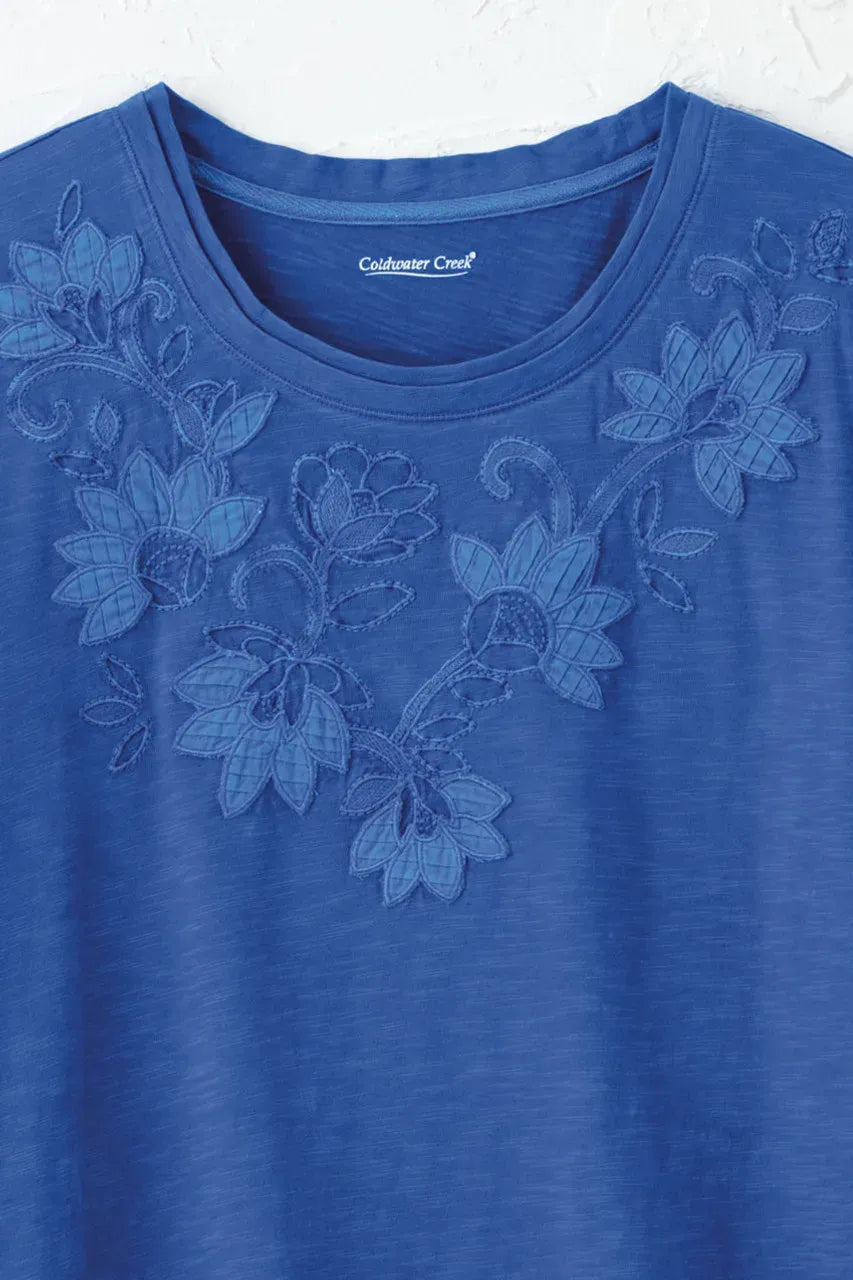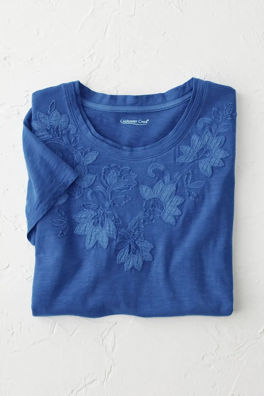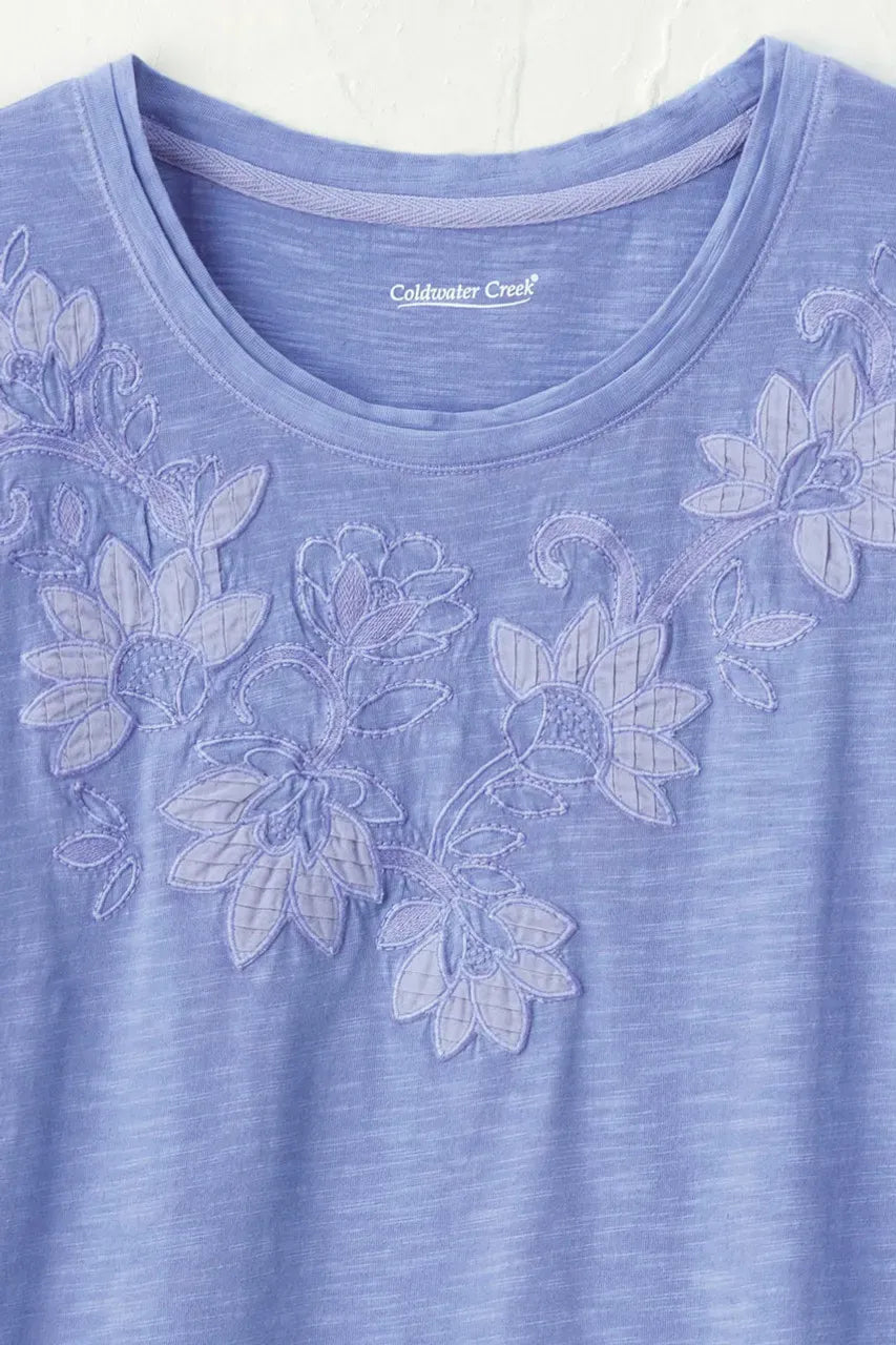 Softly textured slub-knit tee is romanced with floral ribbon appliqués and finished with a layered neckline. Solid back, curved hem. Imported.