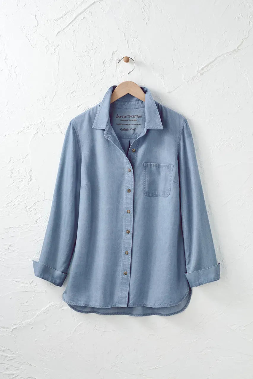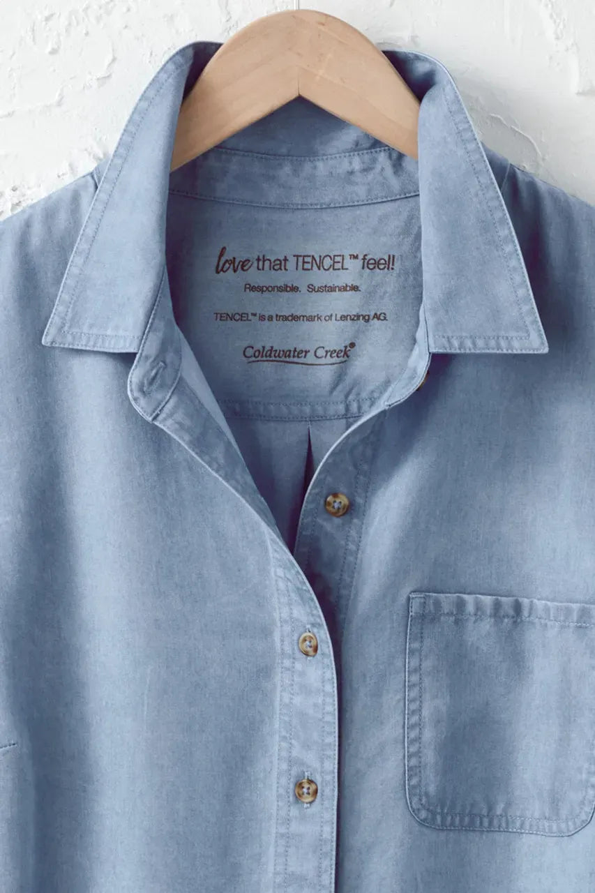 Product Description Our Big Shirt in smooth-draping, eco-friendly TENCEL fabric offers effortless style and all-day comfort. The soft-washed material is naturally breathable with favorite lived-in feel. Features tailored collar and pocket, double-stitched seams for durability, high-low shirttail hem, and cuffed long sleeves you can roll or leave down. Perfect for transitional layering. TENCEL™ is a trademark of Lenzing AG.