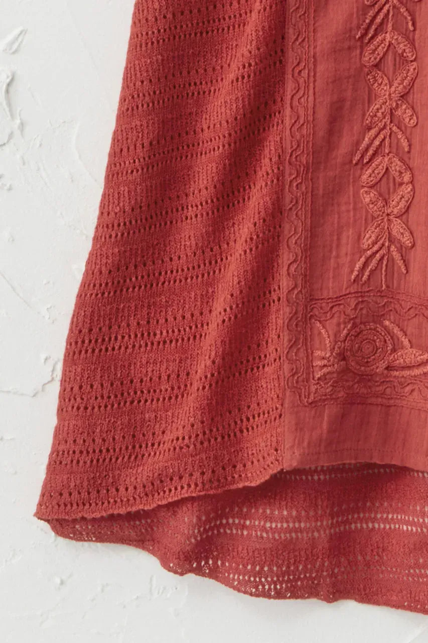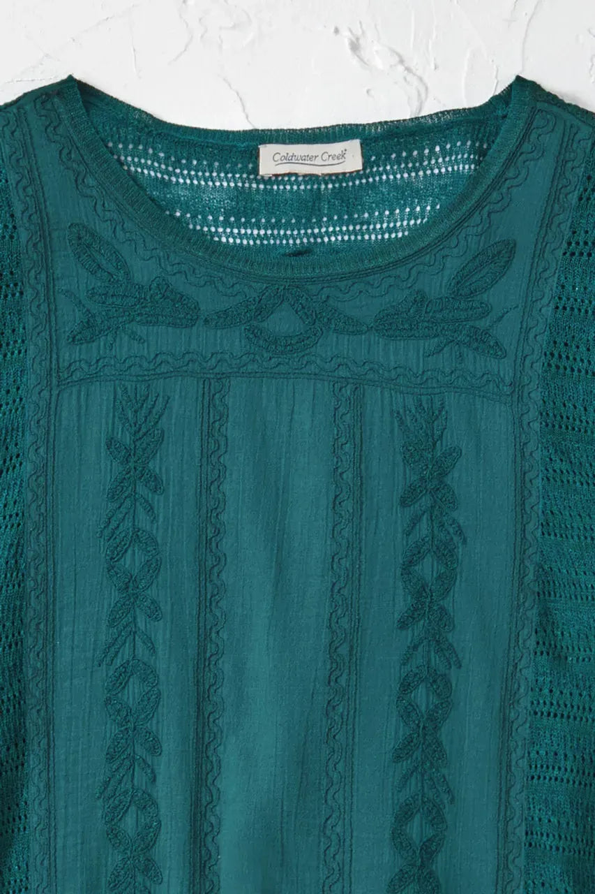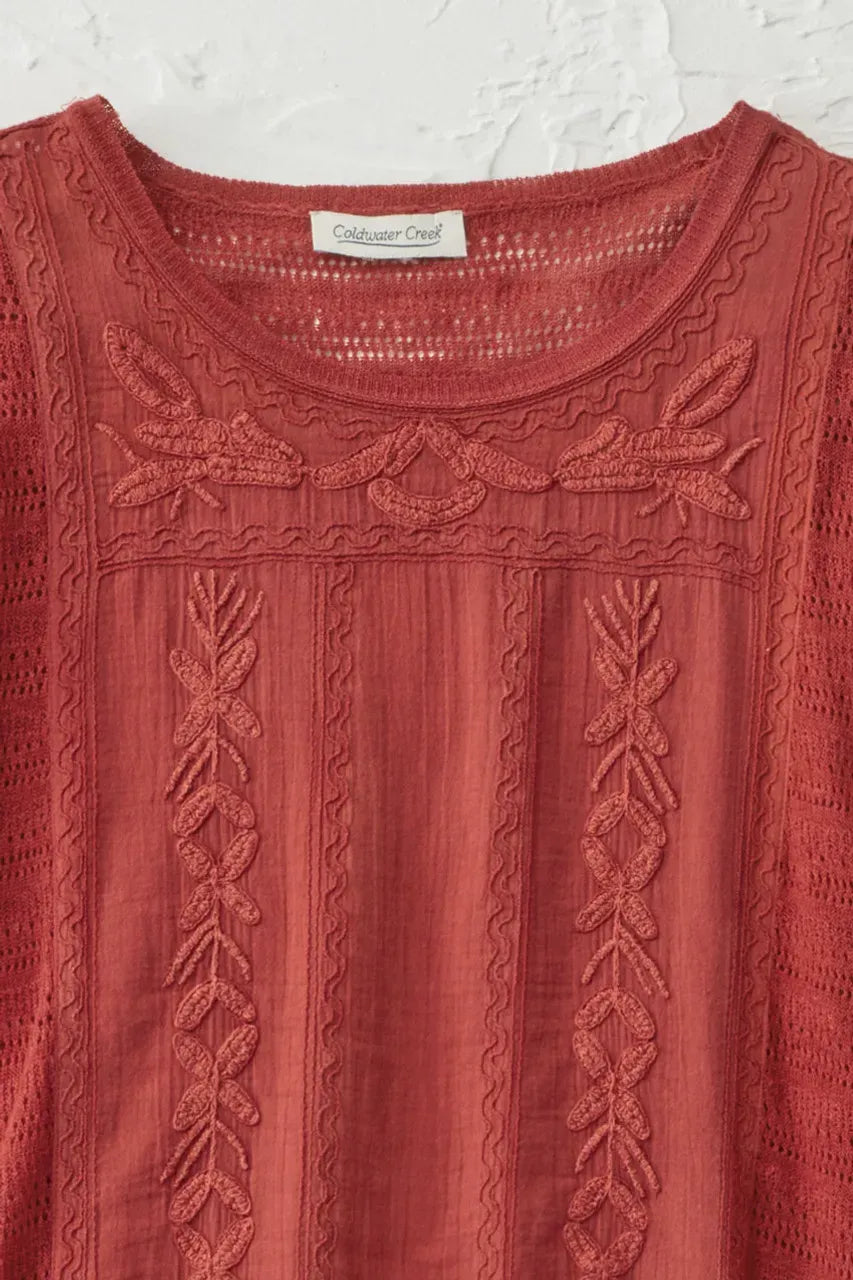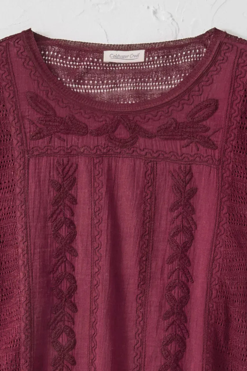 This tonal sweater blends two textures for one-of-a-kind artistry. This beautifully detailed top is light and airy, with a loose knit stitch on the back and sides, and an embroidered woven panel on front. Semi-sheer, pair with a cami for full coverage.