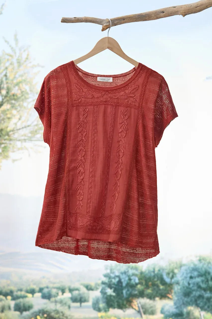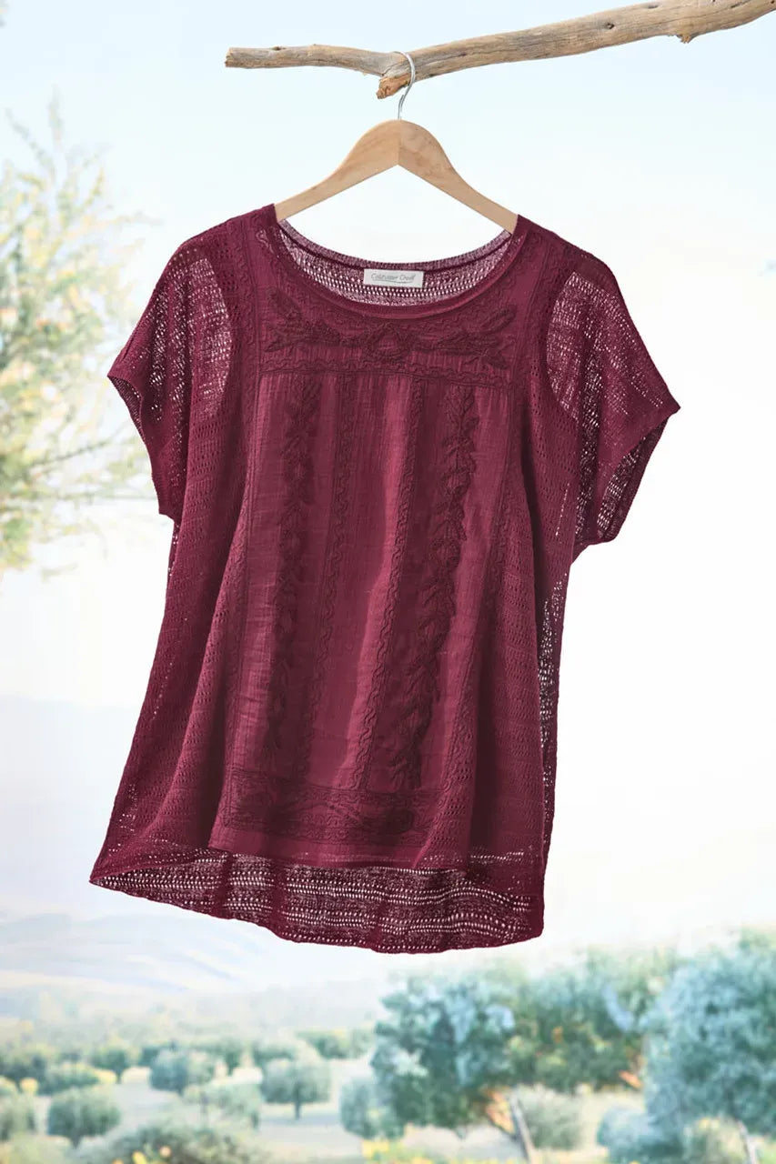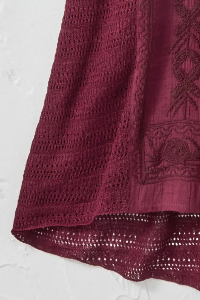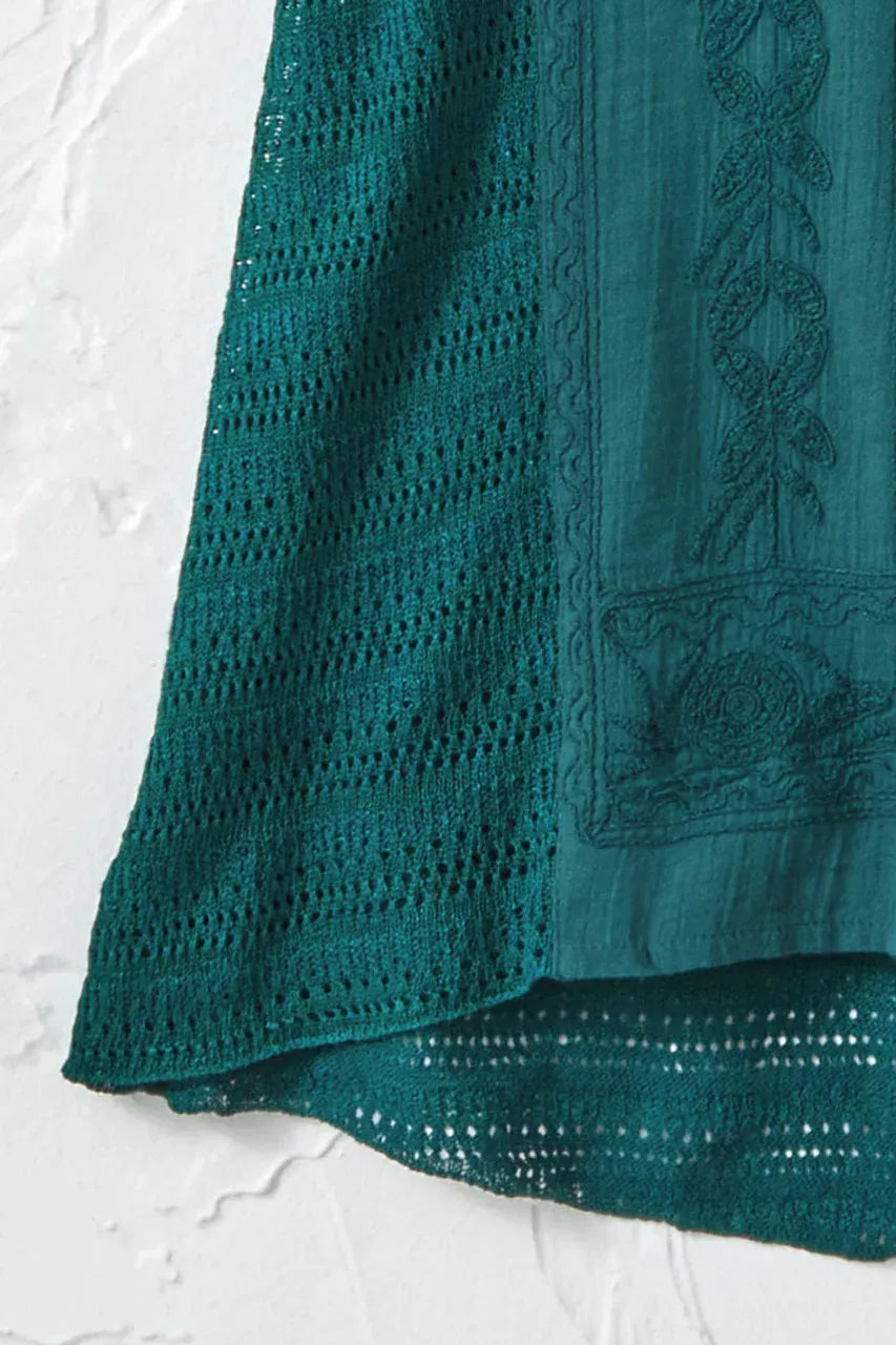 This tonal sweater blends two textures for one-of-a-kind artistry. This beautifully detailed top is light and airy, with a loose knit stitch on the back and sides, and an embroidered woven panel on front. Semi-sheer, pair with a cami for full coverage.