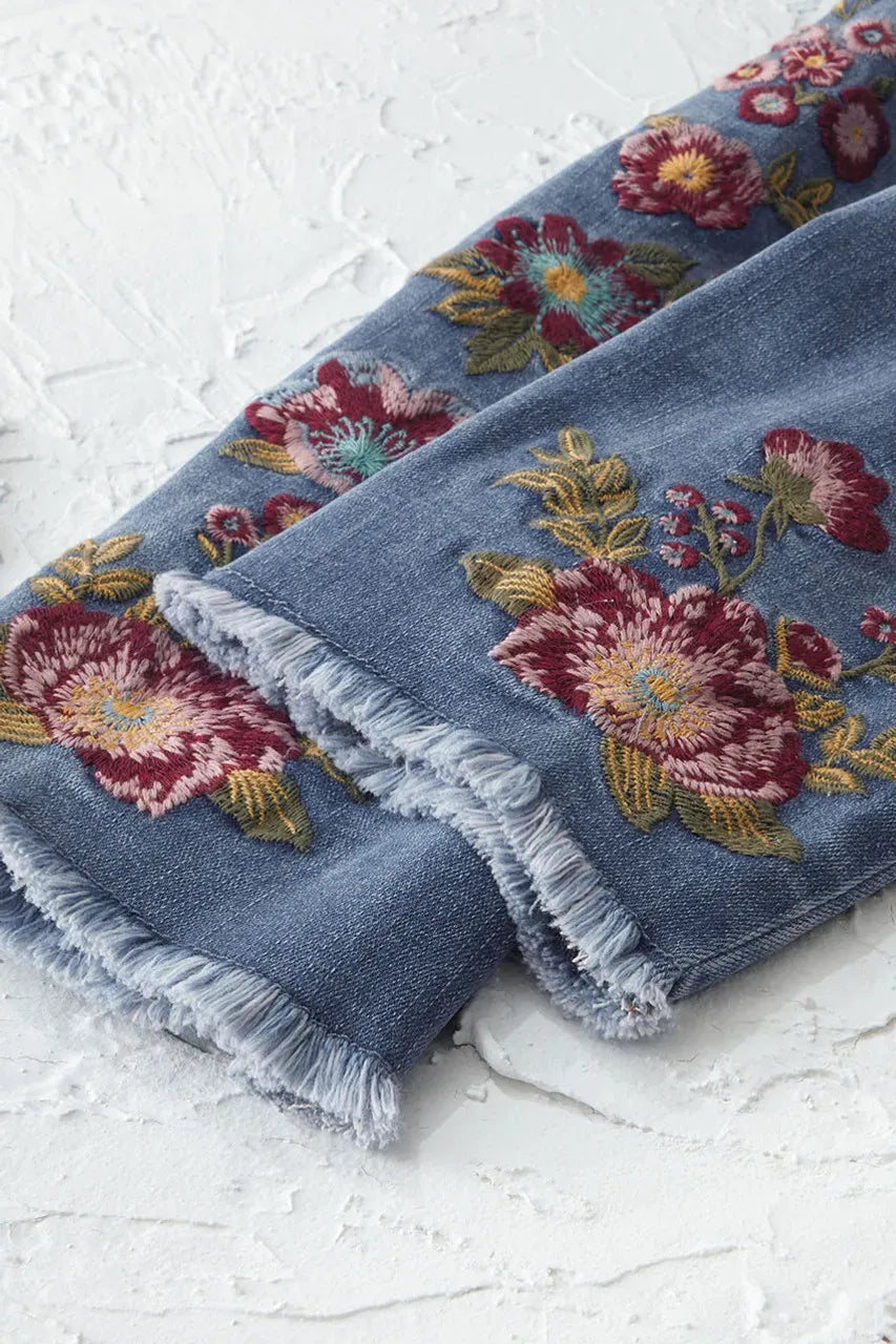 Product Description Embroidered ankle jeans featuring wine-colored florals and frayed hems enhance The Creek's signature denim with artisan-style details. Softly brushed denim offers comfortable stretch that moves with you. Fitted through the hips and thighs, 5-pocket styling. Mid rise sits slightly below the waist, straight leg with 15" opening.