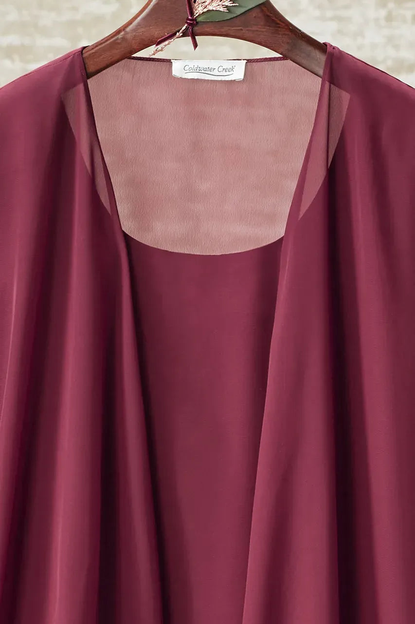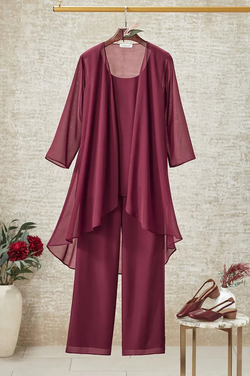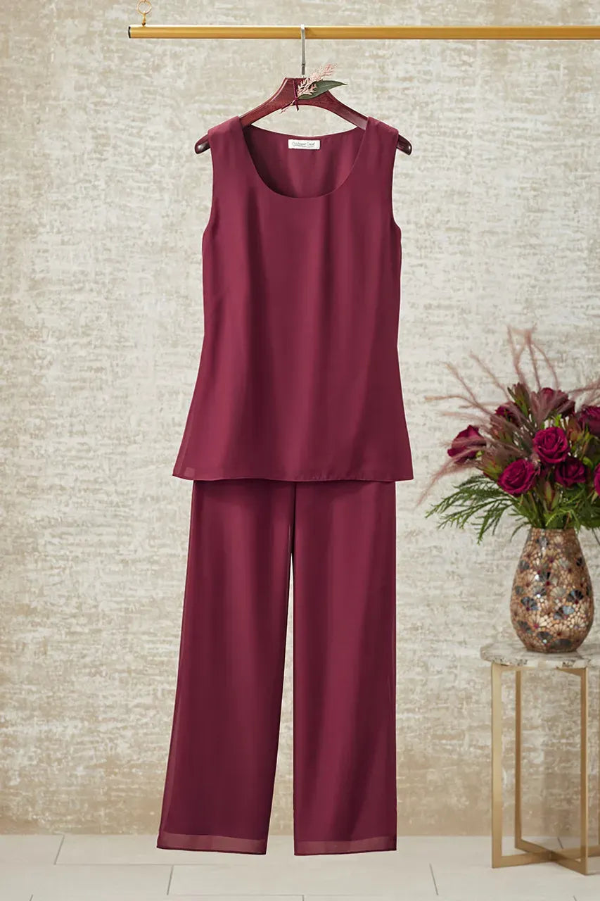 Product Description A striking impression, with so little effort. This 3-piece pants set flows gracefully in sheer, lined georgette. Slightly shaped tank has a gently curved hem. Ankle-length pants.