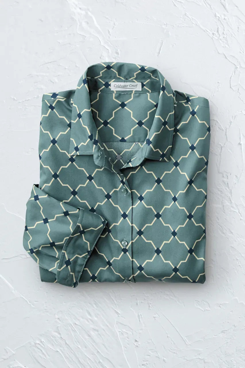 Product Description Latticed geometrics add a bold pattern to our wrinkle-free shirt – a favorite print, now in our 3/4-sleeve silhouette. Great tucked in or not, with reinforced placket and 3/4 button-cuff sleeves.