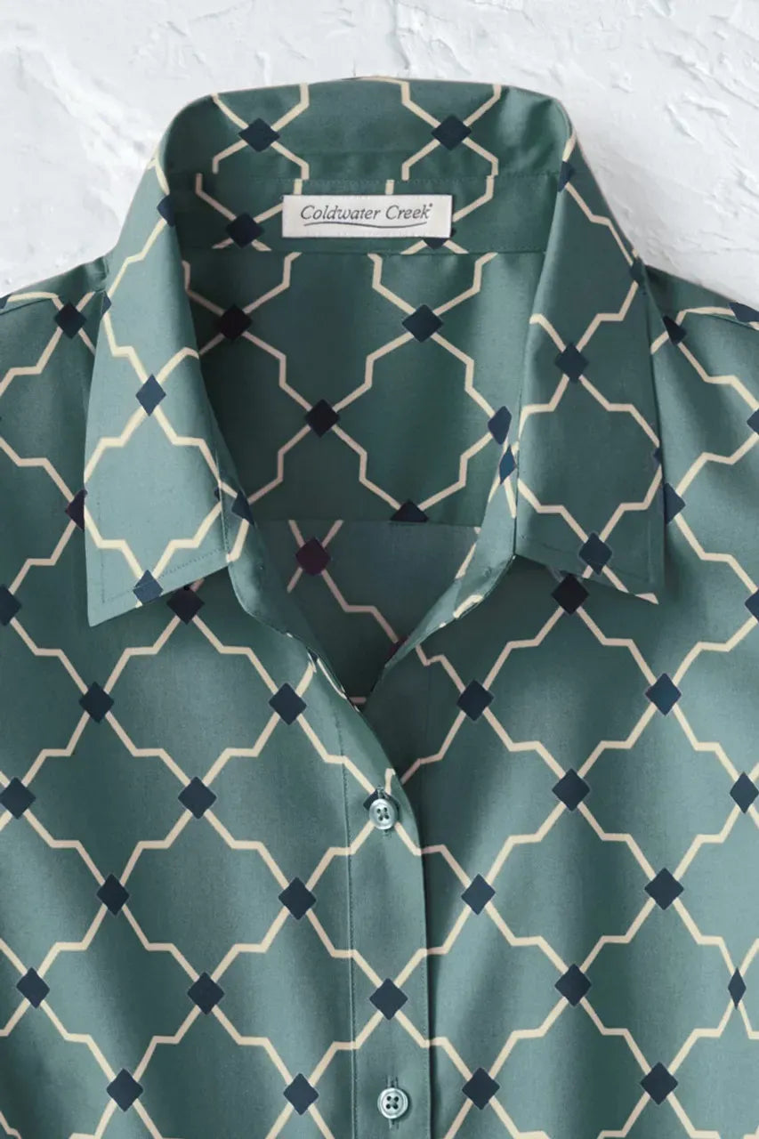 Latticed geometrics add a bold pattern to our wrinkle-free shirt – a favorite print, now in our 3/4-sleeve silhouette. Great tucked in or not, with reinforced placket and 3/4 button-cuff sleeves.