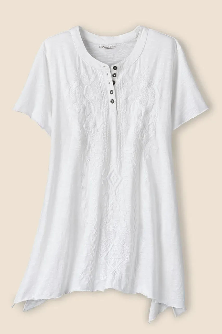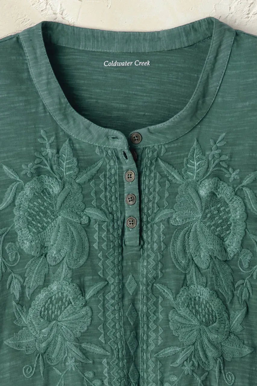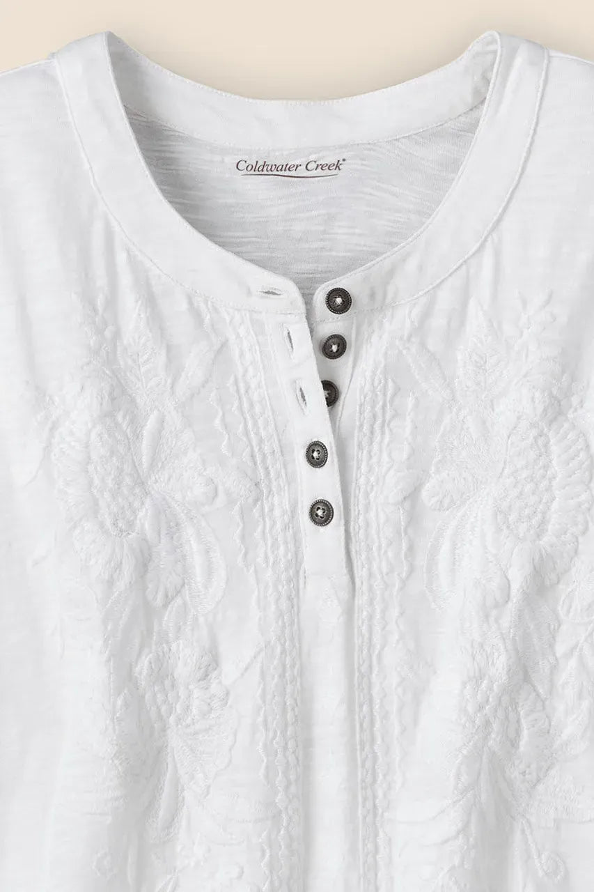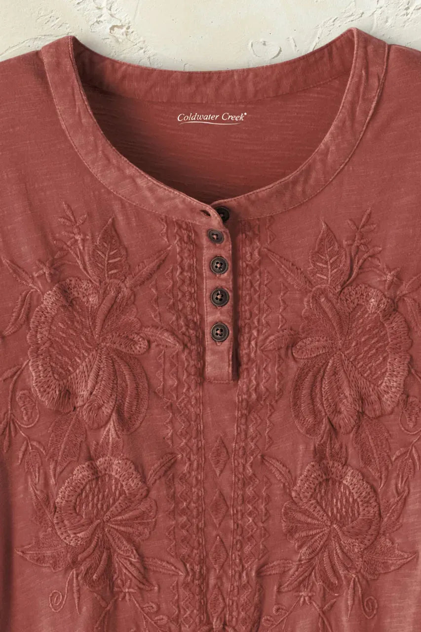 Subtle floral embroidery traces the front of this soft slub-jersey top. Half-button placket, straight hem. Imported.
