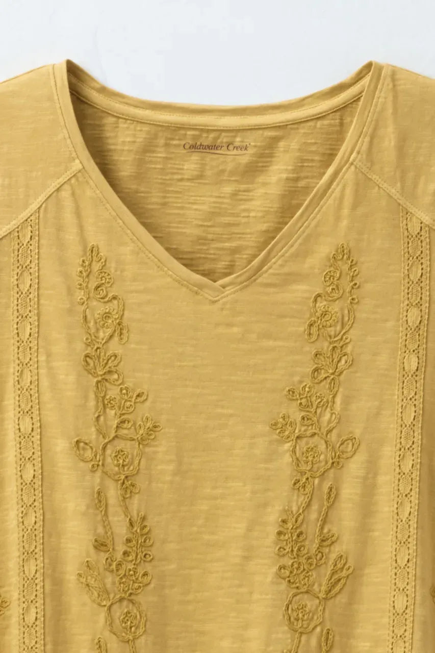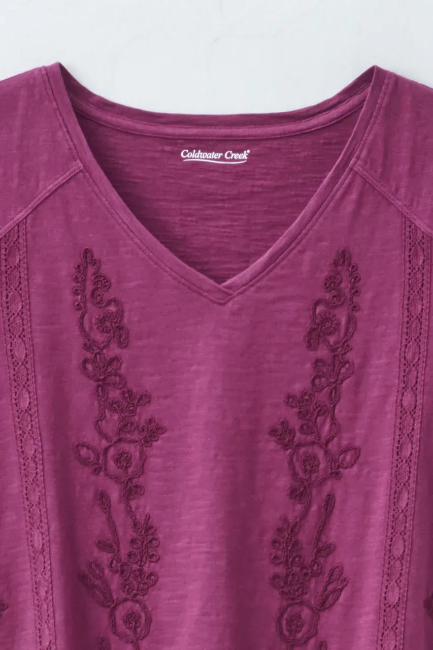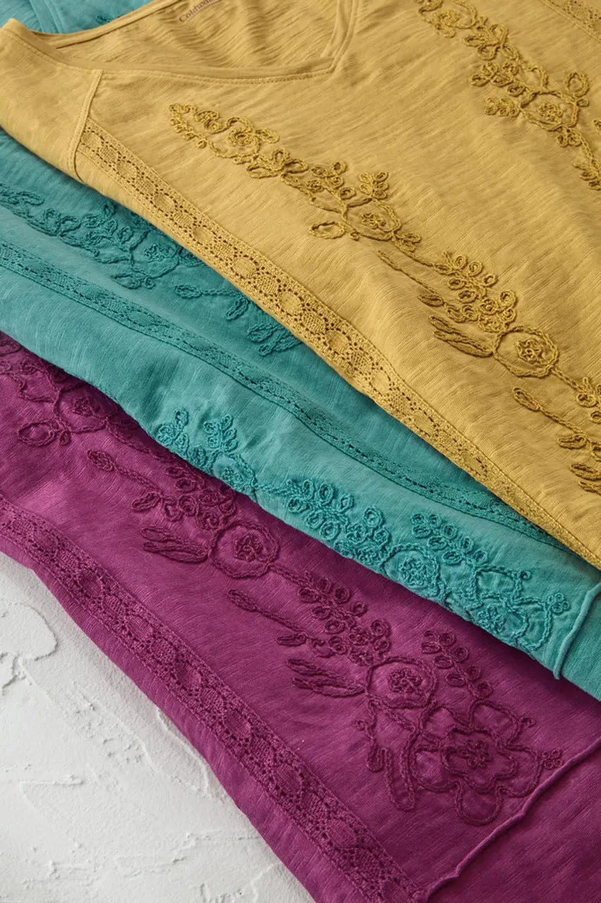 Our soft slub knit tee shirt displays unique artistry with embellished soutache embroidery, raw-edge seams and a touch of lace. Soft and lightweight, with a slight A-line shape and side-slit hem.