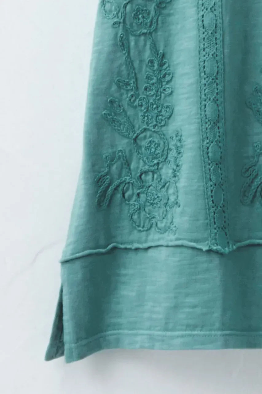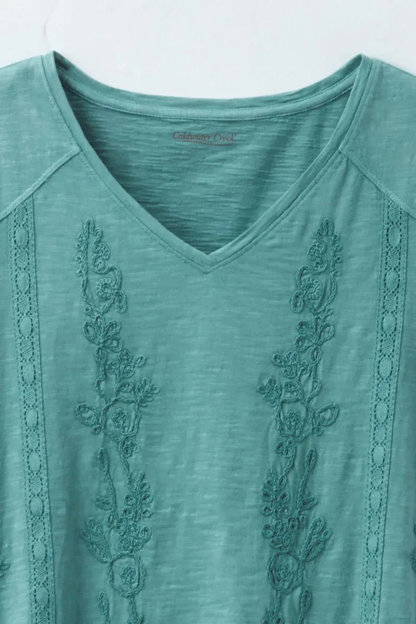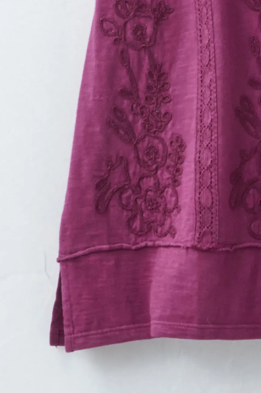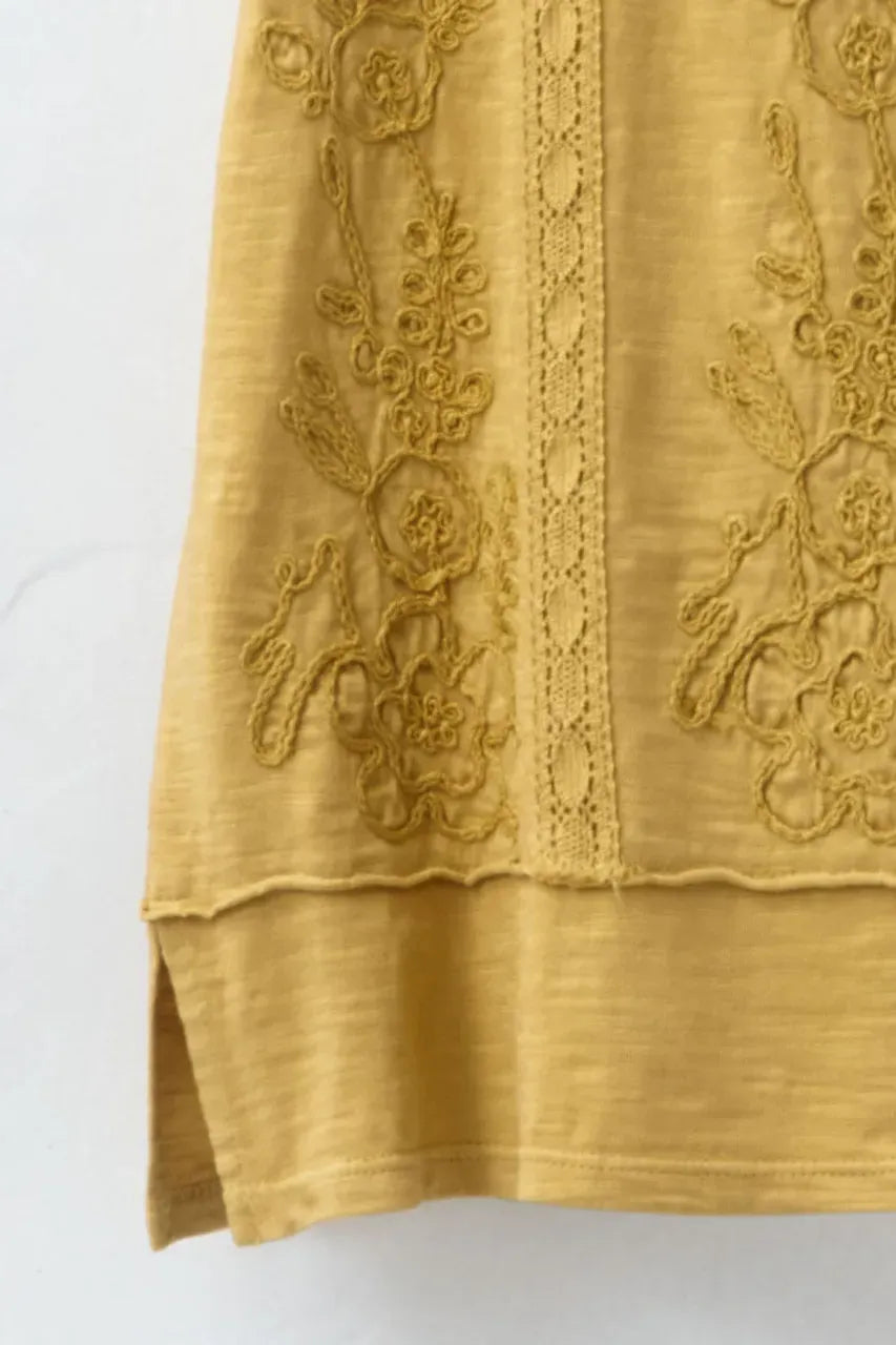 Our soft slub knit tee shirt displays unique artistry with embellished soutache embroidery, raw-edge seams and a touch of lace. Soft and lightweight, with a slight A-line shape and side-slit hem.