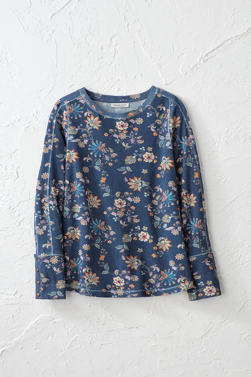 Our waffle knit tee in a new botanical print offers comfortable style with distinctive texture. The soft, lightweight cotton drapes beautifully and features looped cover-stitch seams for added detail. Slightly dropped crewneck, long button-cuff sleeves, and curved hem create a flattering look and versatile styling. Perfect for layering or wearing solo through changing seasons. Relaxed fit, hits mid hip.