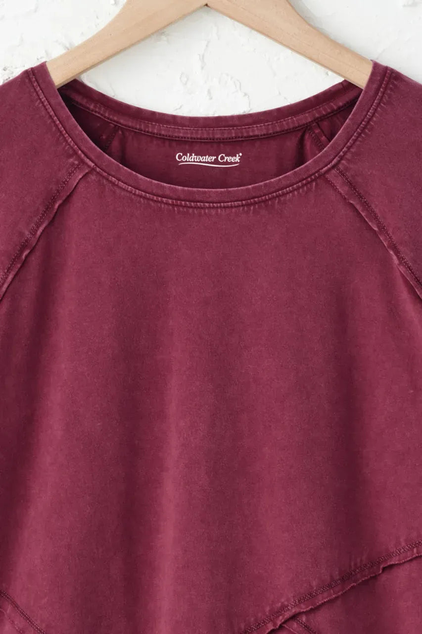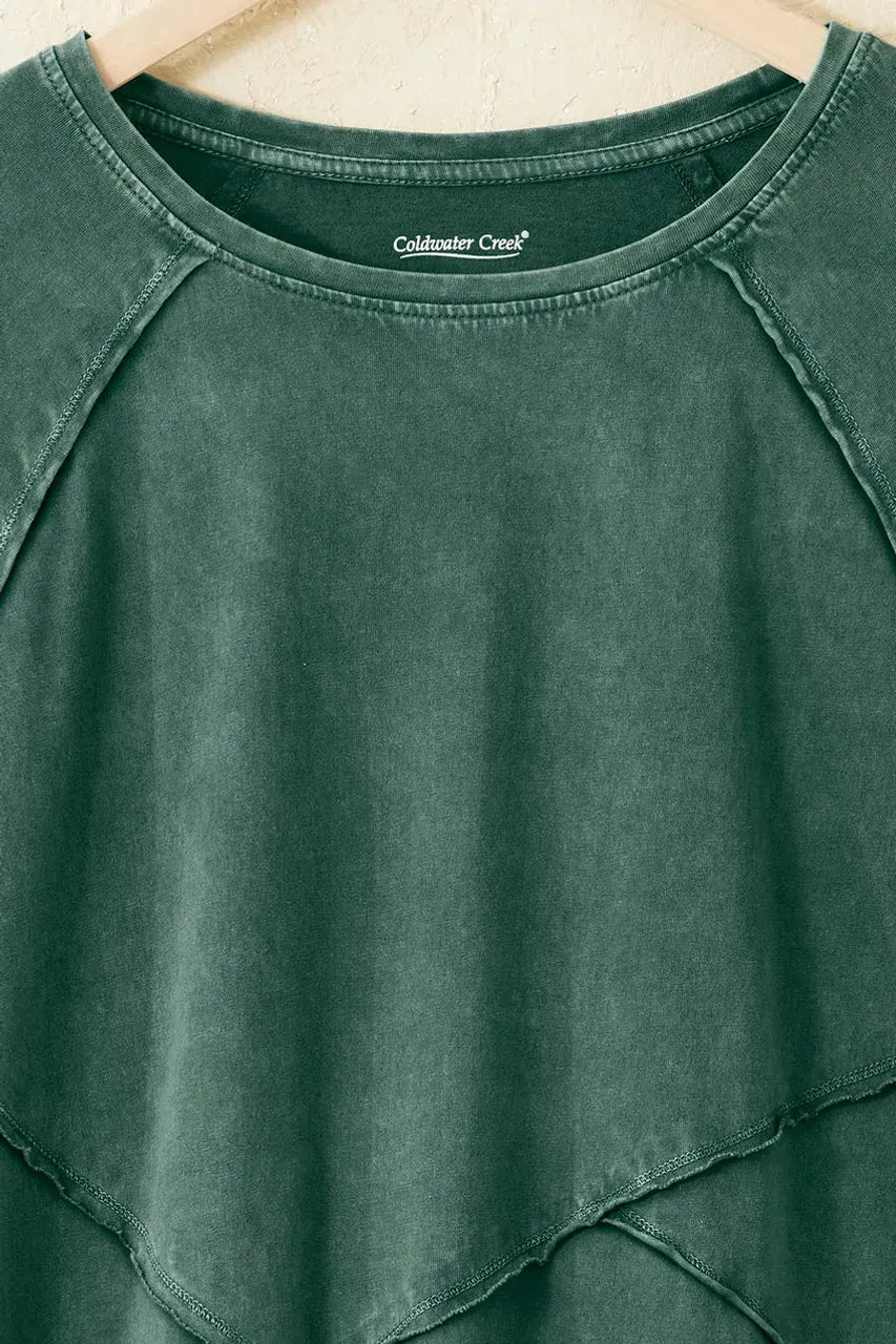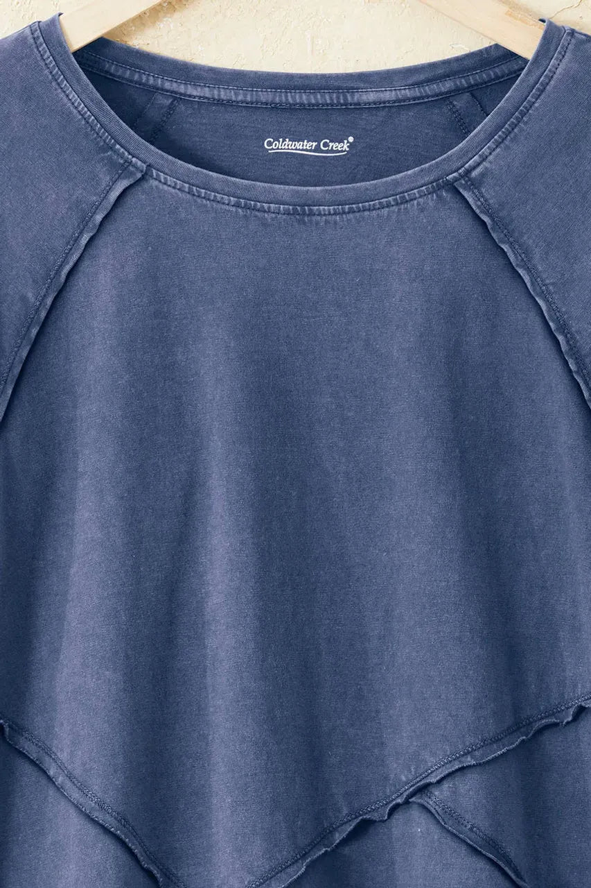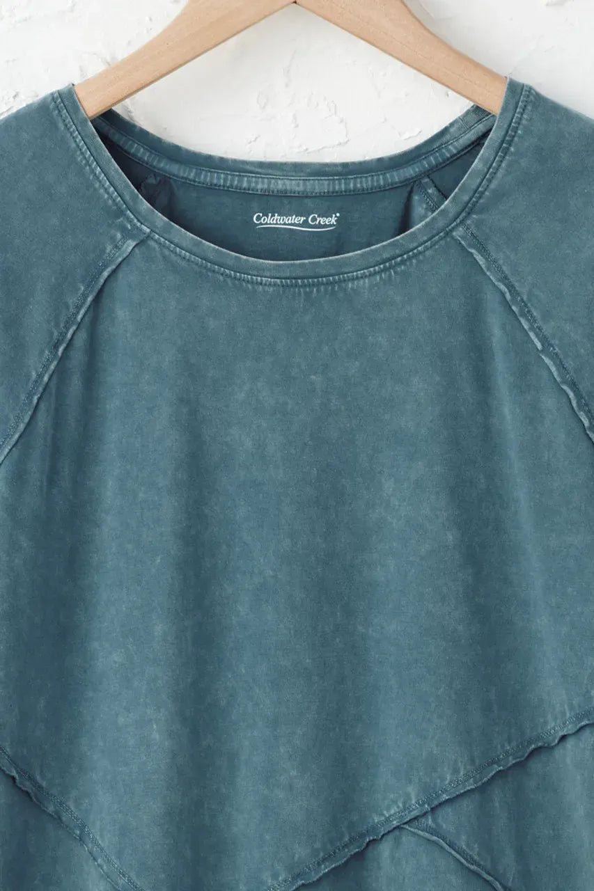 Asymmetrical raw-edge seams on front and back give this lightweight tunic an organic, artsy vibe. Vintage-washed jersey knit features our special wash that creates subtle, one-of-a-kind color variations – so each top is unique. Raglan sleeves and curved slit hem.