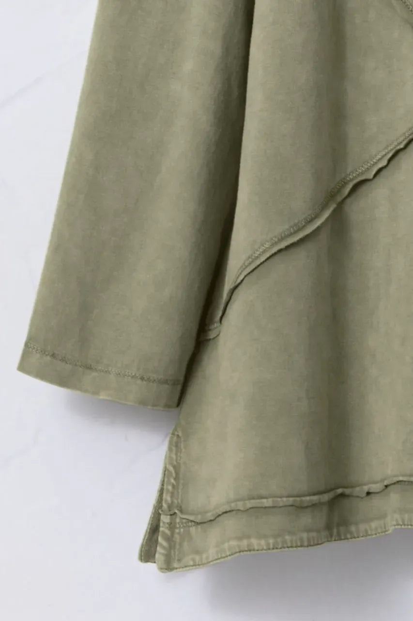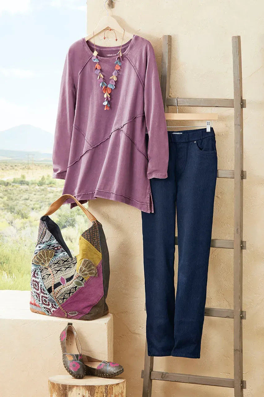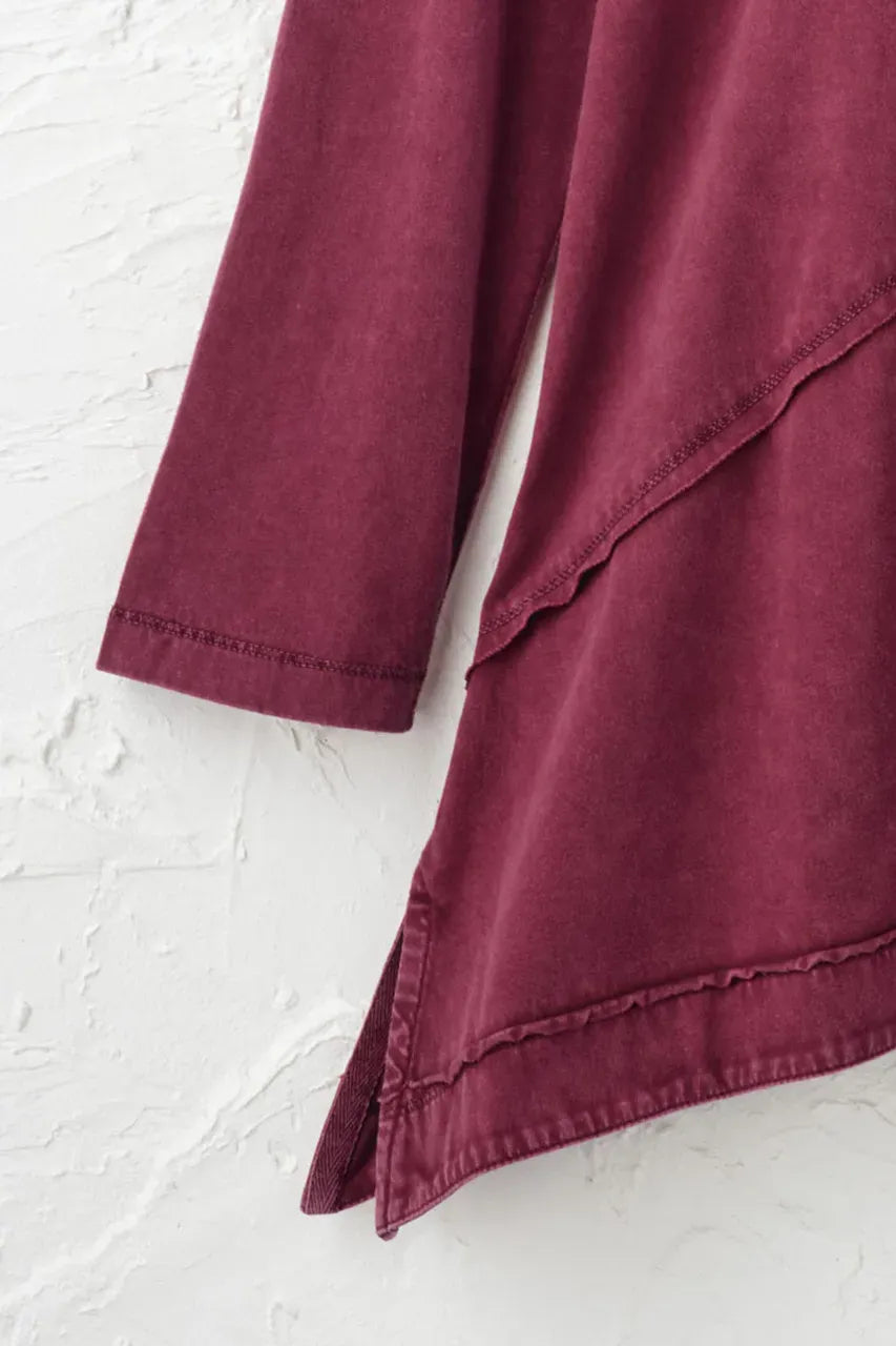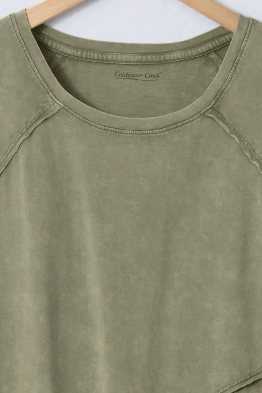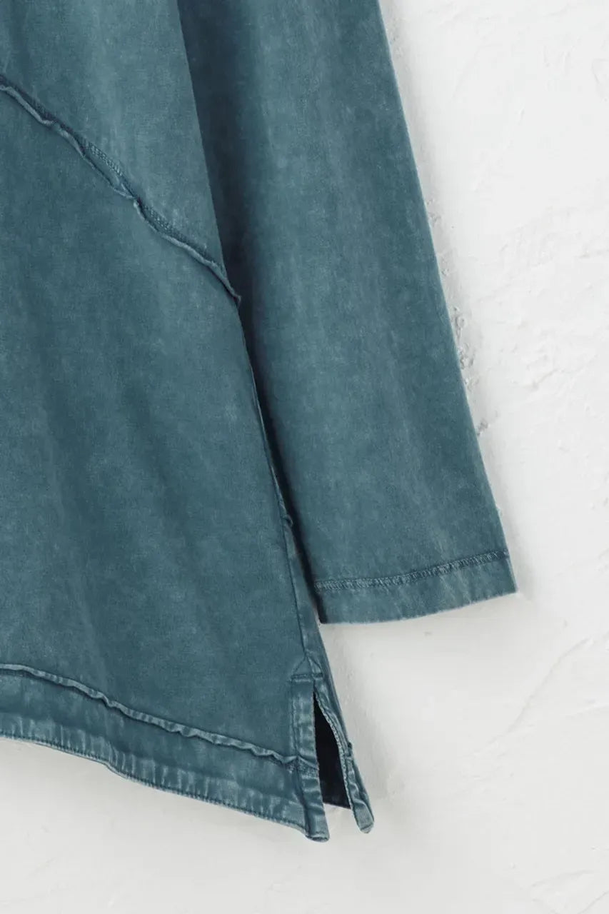 Asymmetrical raw-edge seams on front and back give this lightweight tunic an organic, artsy vibe. Vintage-washed jersey knit features our special wash that creates subtle, one-of-a-kind color variations – so each top is unique. Raglan sleeves and curved slit hem.