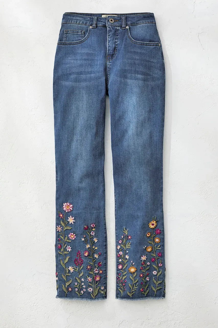 Product Description Jewel-toned wildflowers climb from frayed hems, richly embroidered with a happy vibe. Our soft-brushed stretch ankle jeans are fitted through the hips and thighs, with 5-pocket styling.