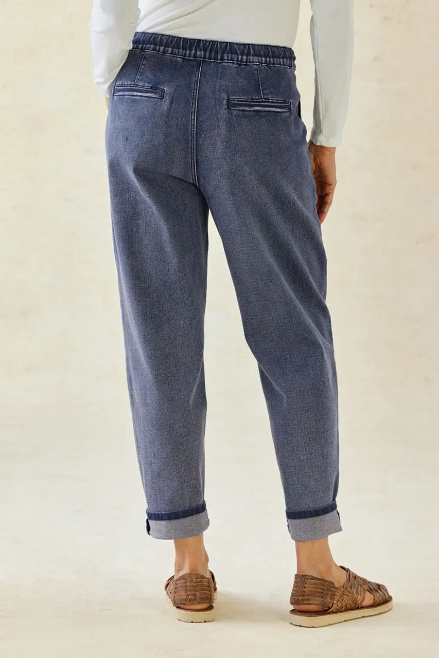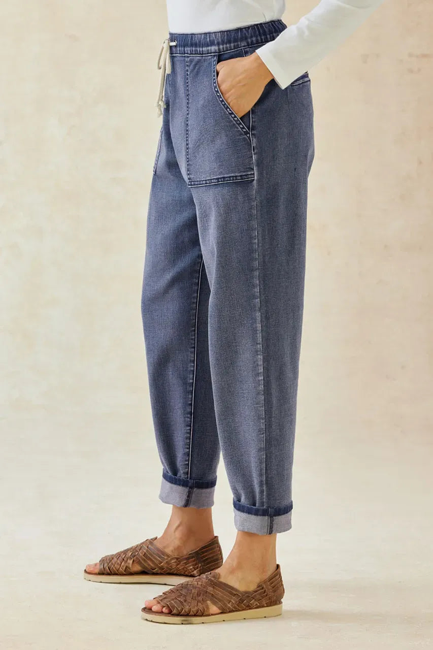 The summer jeans you’ll want to wear everywhere. Relaxed and lightweight, with a pull-on waist and rope drawstring, plus front square pockets and back welt pockets. Ankle length, to cuff or not.
