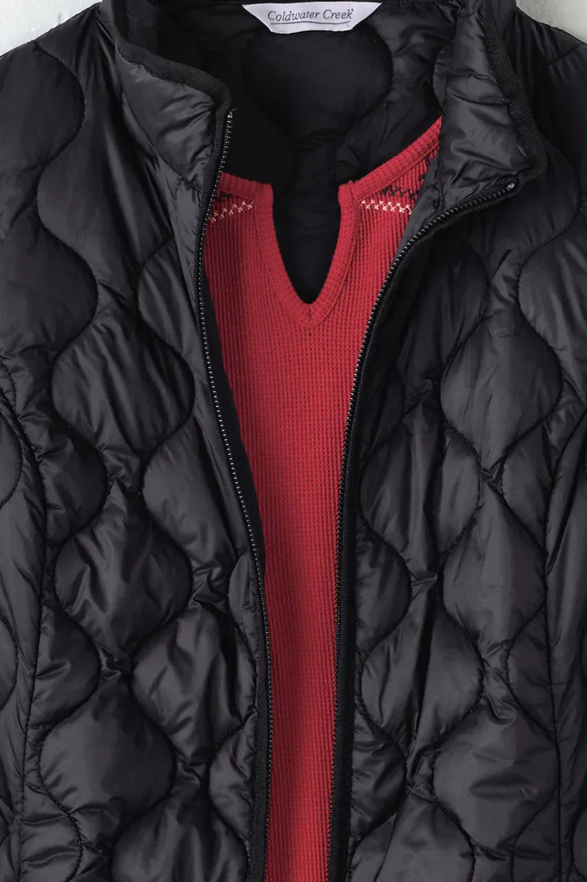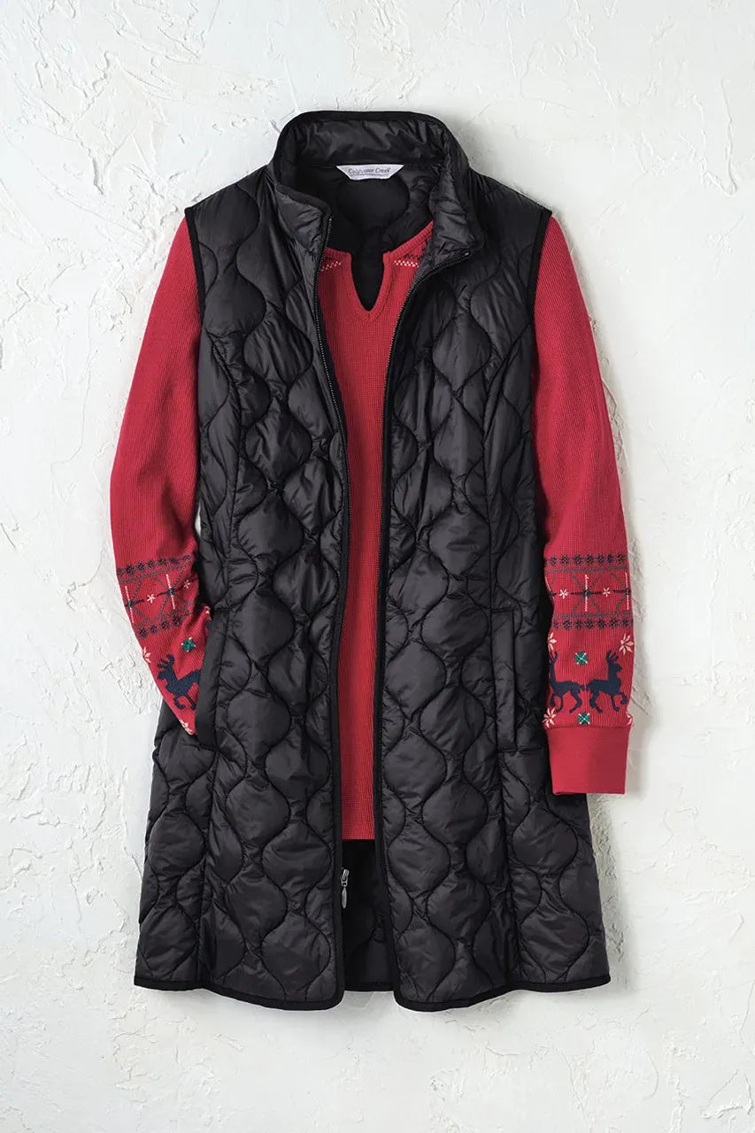 Product Description This vest’s ultra-long length creates an instant statement outfit. Princess seaming and cinched back elastic provide a flattering fit – plus it’s ultra-lightweight and packable at only 10 oz. Zip front, on-seam pockets, one inner pocket.