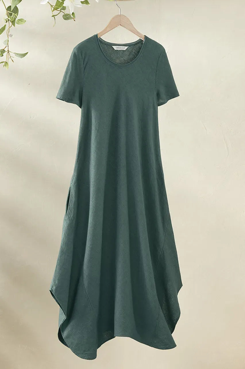 Product Description A contemporary dress with unexpected flow. This light slipover style features a swingy, seamed handkerchief hem – in European-grown linen blended with viscose for a soft, smooth touch.