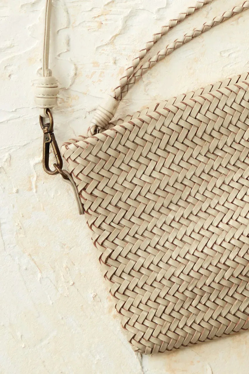 Handwoven leather gives this bag a wonderful zigzag texture, in a versatile size that works as a wristlet or crossbody style. Handcrafted.