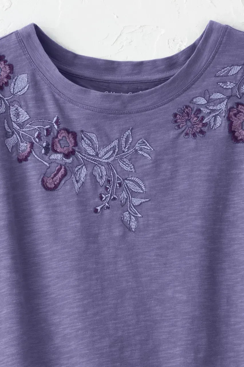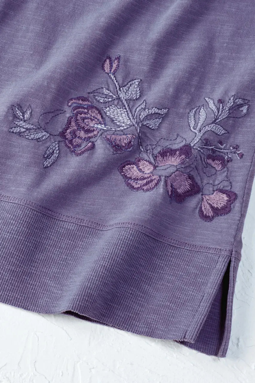 Casual comfort, with extra-special touches. Beautiful floral embroidery and raw edges add an artful element to this slub knit top. Dropped shoulders with cap sleeves, ribbed side-slit hem. Imported.