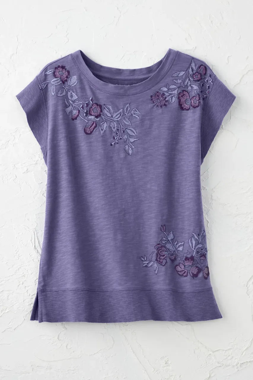 Product Description Casual comfort, with extra-special touches. Beautiful floral embroidery and raw edges add an artful element to this slub knit top. Dropped shoulders with cap sleeves, ribbed side-slit hem. Imported.