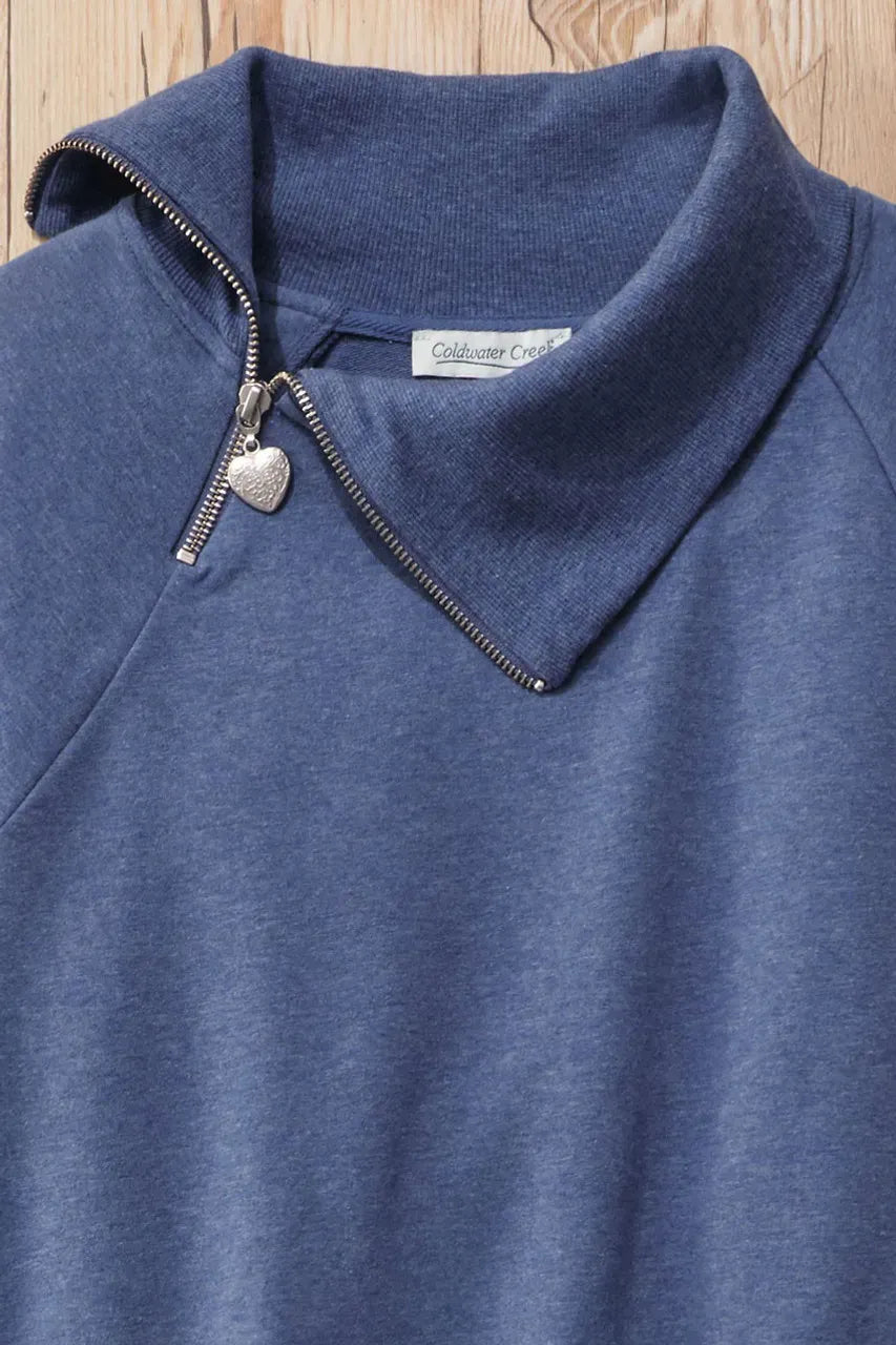 Comfort, finessed. Luxuriously soft in sueded French terry, this midweight pullover features an envelope neckline with zipper and a side-slit, slightly high-low hem. Ribbed trim, long raglan sleeves. Oversized fit, hits mid hip. Cotton/spandex. Machine wash.