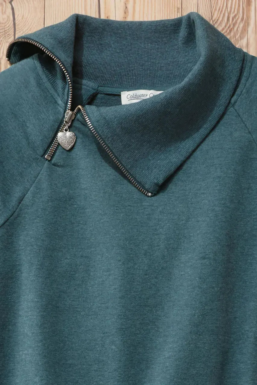 Product Description                        Comfort, finessed. Luxuriously soft in sueded French terry, this midweight pullover features an envelope neckline with zipper and a side-slit, slightly high-low hem. Ribbed trim, long raglan sleeves. Oversized fit, hits mid hip. Cotton/spandex. Machine wash.