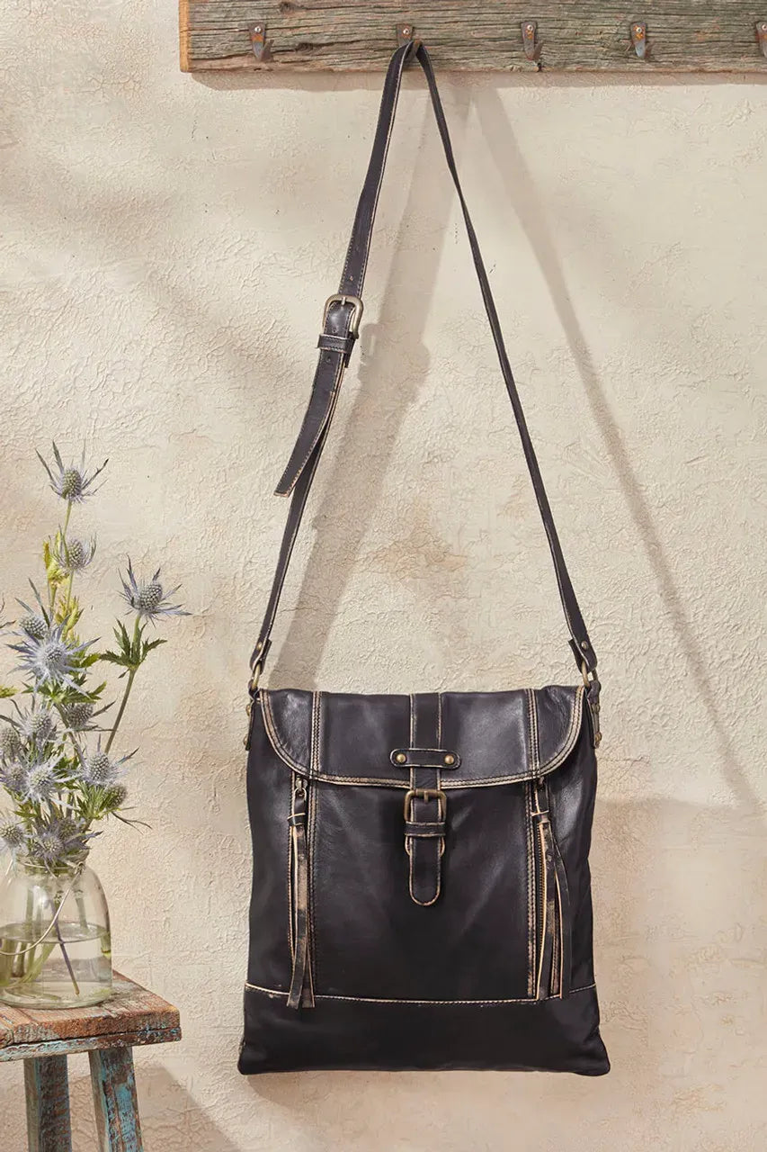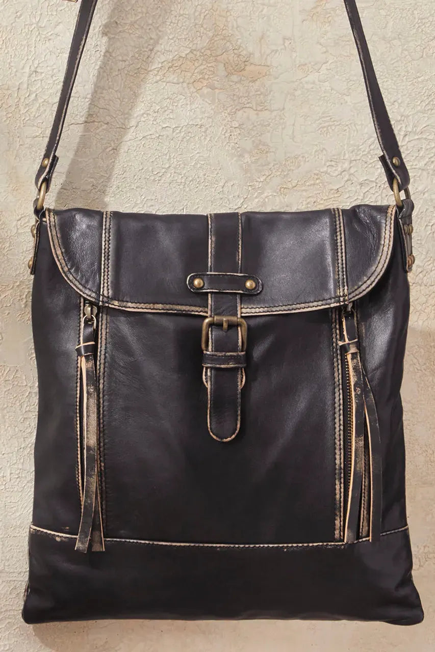 The luxurious look of broken-in leather, with convenient top zip and decorative front strap.